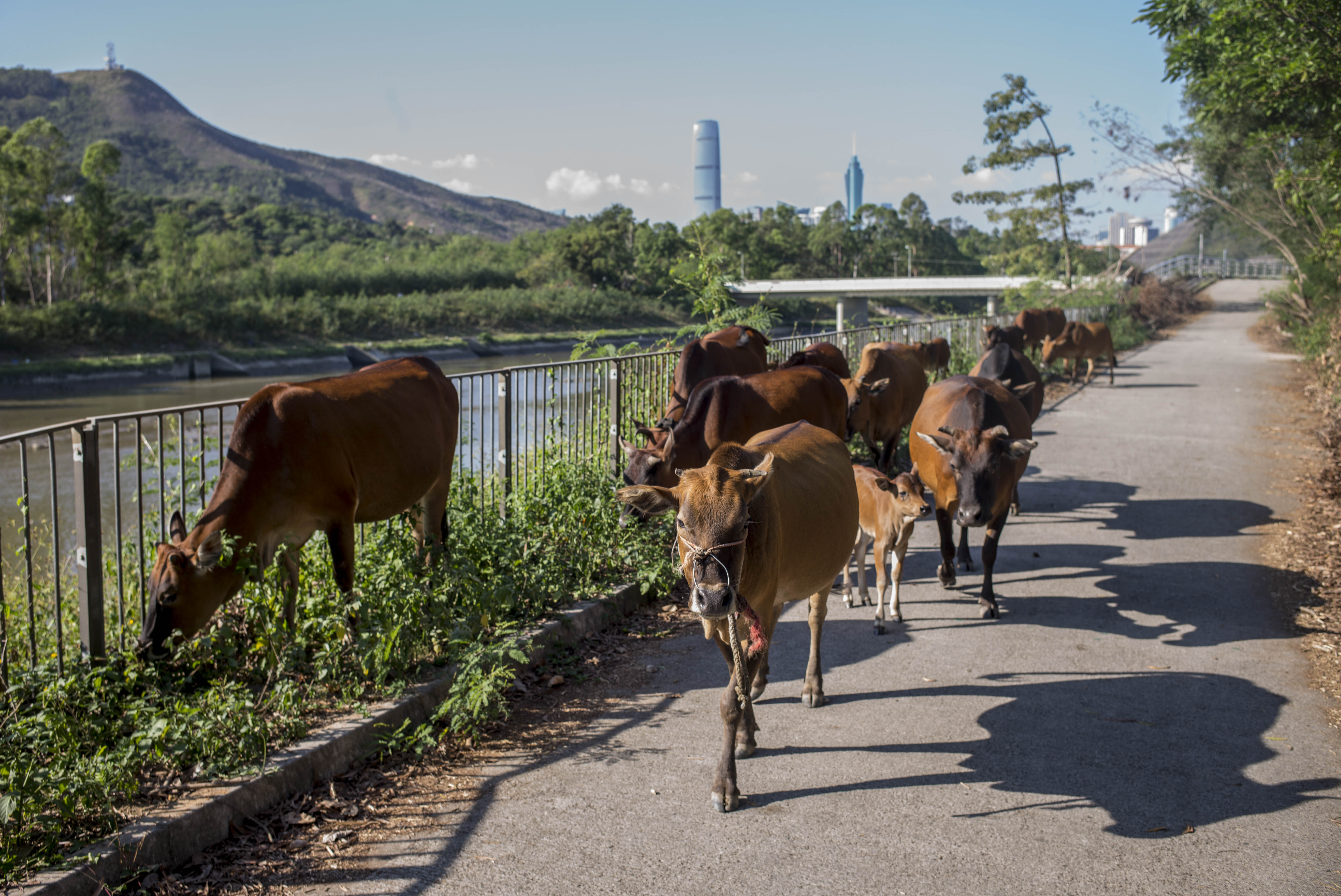 上水梧桐河邊,每天下午,三四十隻牛總會定時出現,沿河踱步,在東江水管旁的樹林邊吃草,一個阿伯拿著一條樹枝,踏著單車,趕著牛群沿河前行。