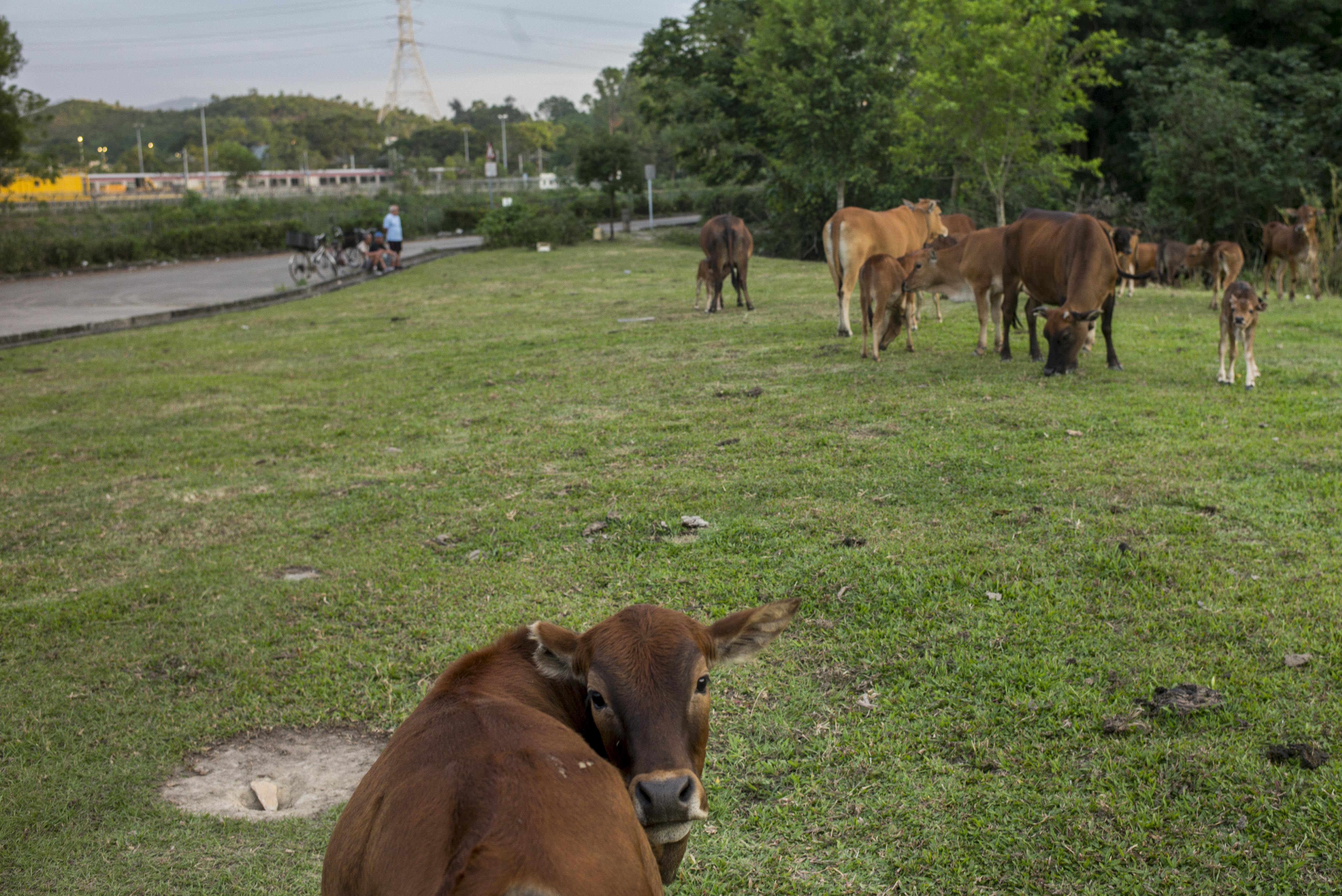 圖說:吃草的牛每天都會見到在羅湖與上水之間往來的港鐵班車,伴隨著城市化,草地越來越少,牛群的覓食之地,也離城市越來越近。