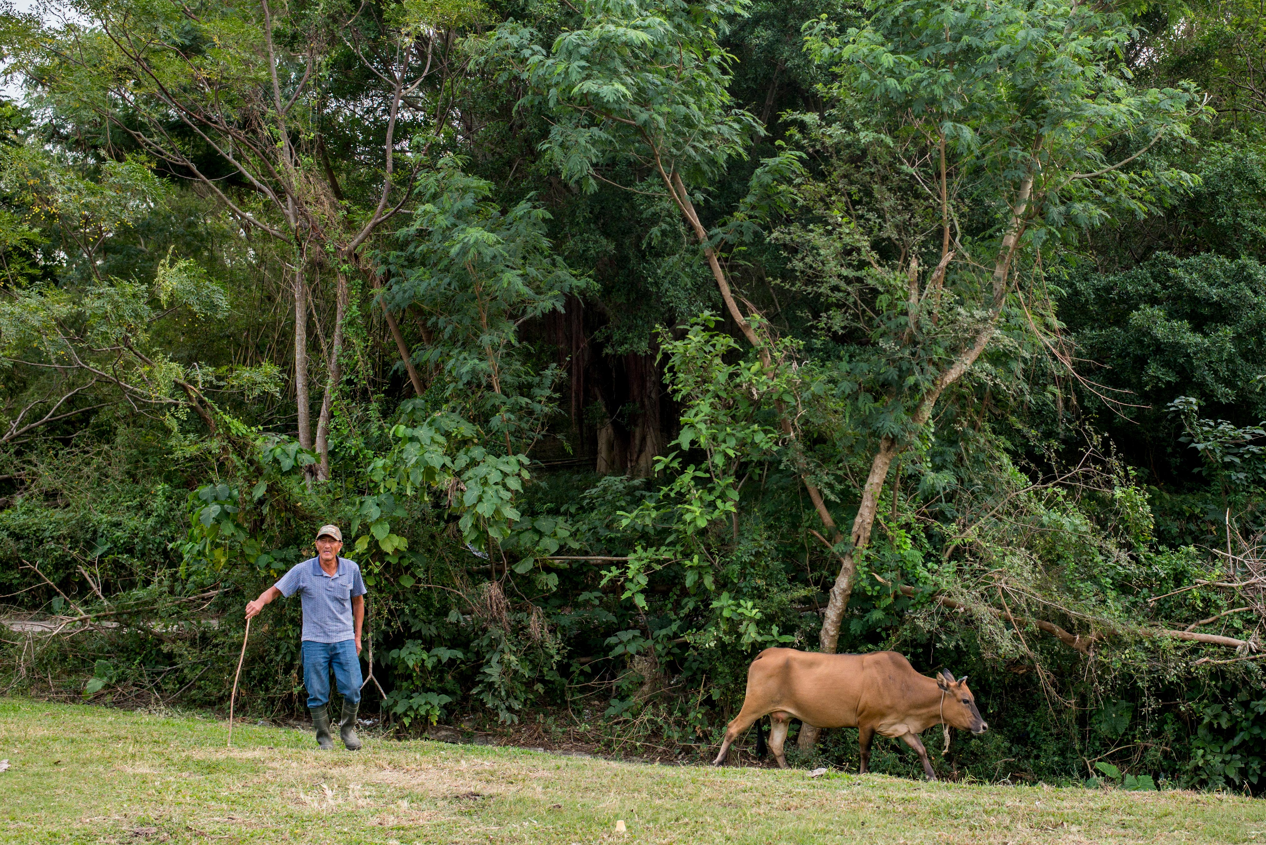 在這上水河邊,阿伯是數十年的放牛人。他姓胡,今年75歲,早年他在順德農村跟家人一起養牛種菜,1966年,23歲的他從順德偷渡來港,半年後就遇上六七暴動,不過他沒怨言。「起碼在香港有得食有的住,在內地食都無得食。」他先在九龍做工人,後來到了農場養魚,70年代開始,他離開了農場,一個人買了五頭牛,像小時候一樣,開始每天沿著梧桐河放牛養牛。