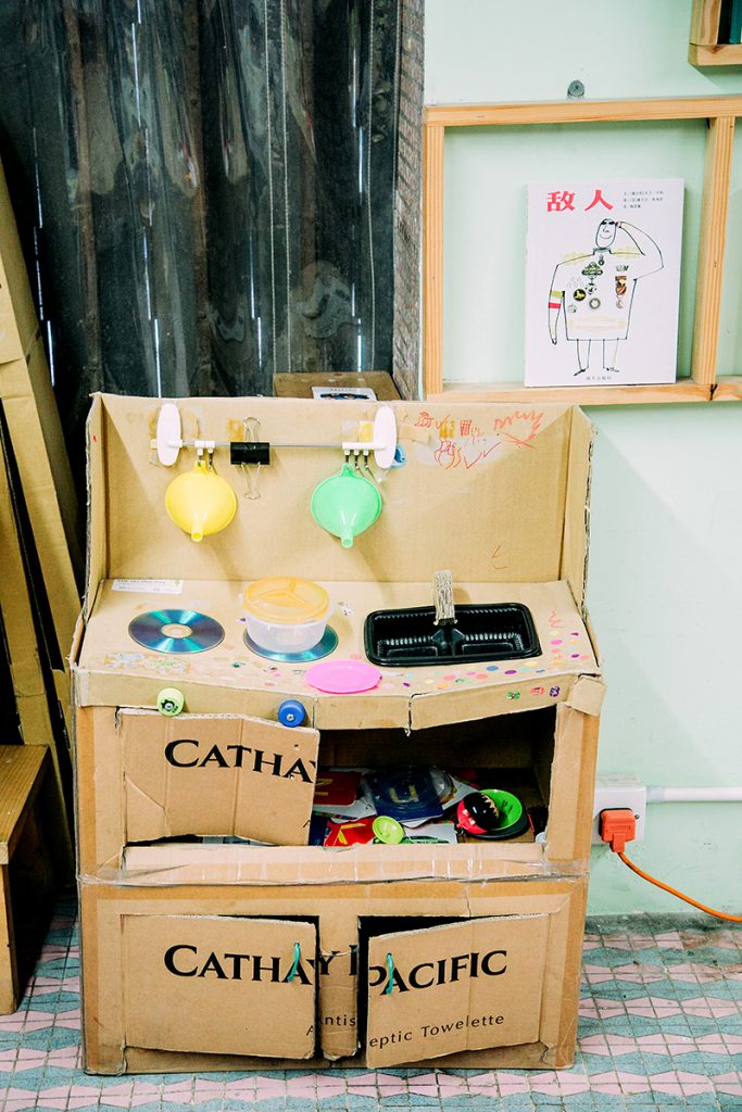 Vancy 表示,百好士多是由一眾義工家長輪流經營,但他們都是綠腳丫繪本讀書會的成員。綠腳丫活動多在市區舉行,屯元天的媽媽們長途跋涉有點辛苦,所以一直希望在這一區有個聚腳的地方。後來,綠腳丫經朋友介紹,得知藍地這裡有一個丟空多年的士多可用,一群家長就紛紛到這裡幫忙裝修粉飾,打造出如今的面貌 —— 用舊木製成的書架上放滿繪本和圖書,幾張小木檯拼湊出勞作區,還有升級再造而成的玩具,一片親切可愛的兒童活動空間。