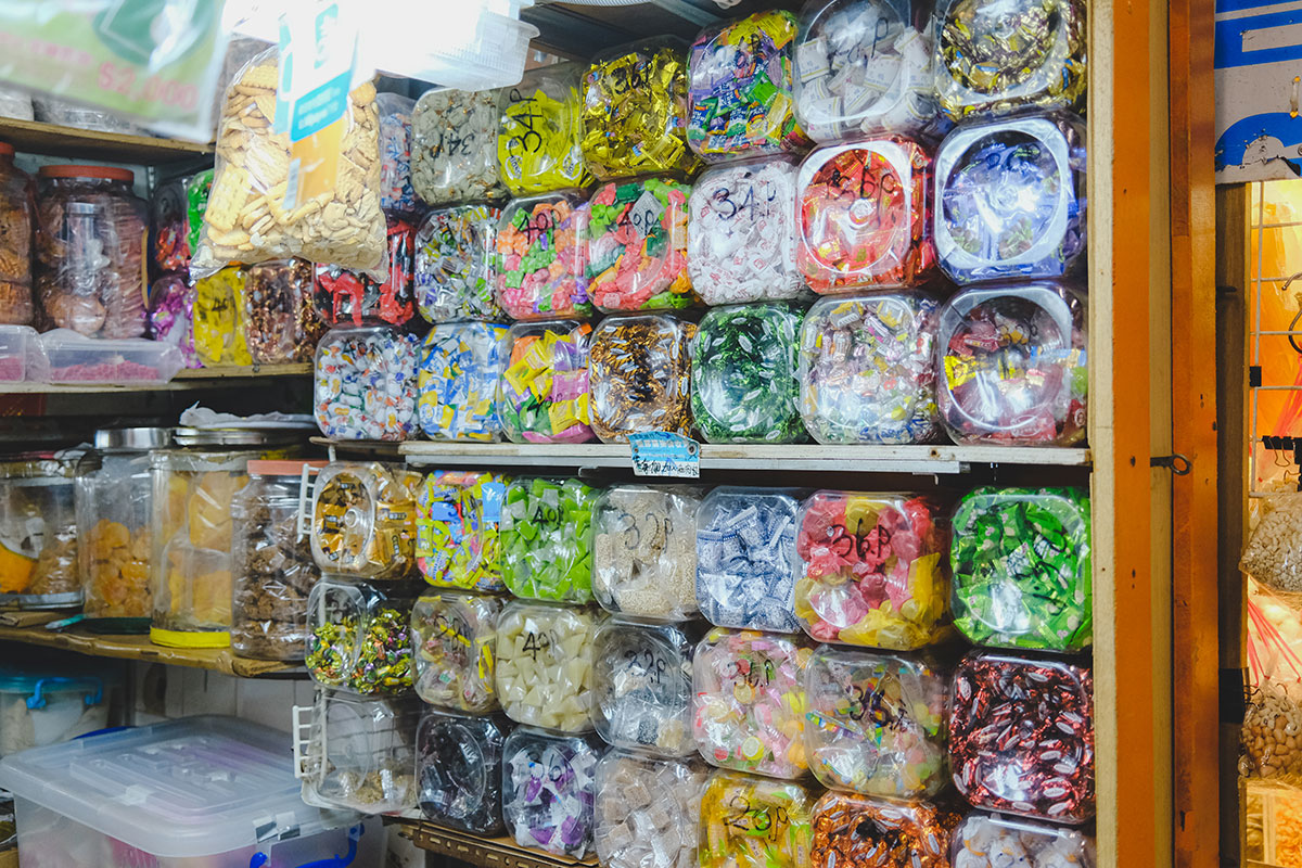 裝糖果的膠樽整齊排在牆角的貨架,色彩繽紛奪目。