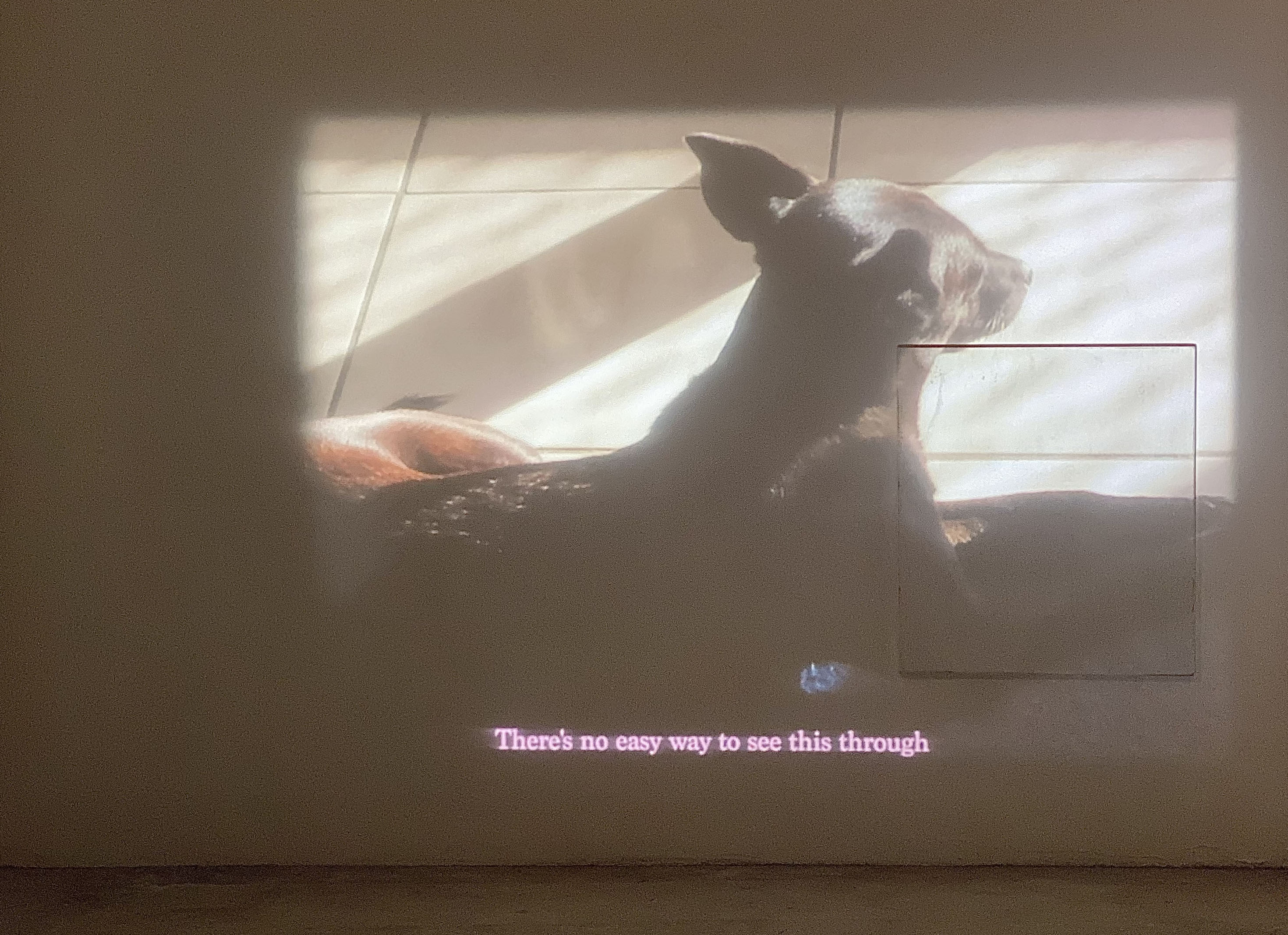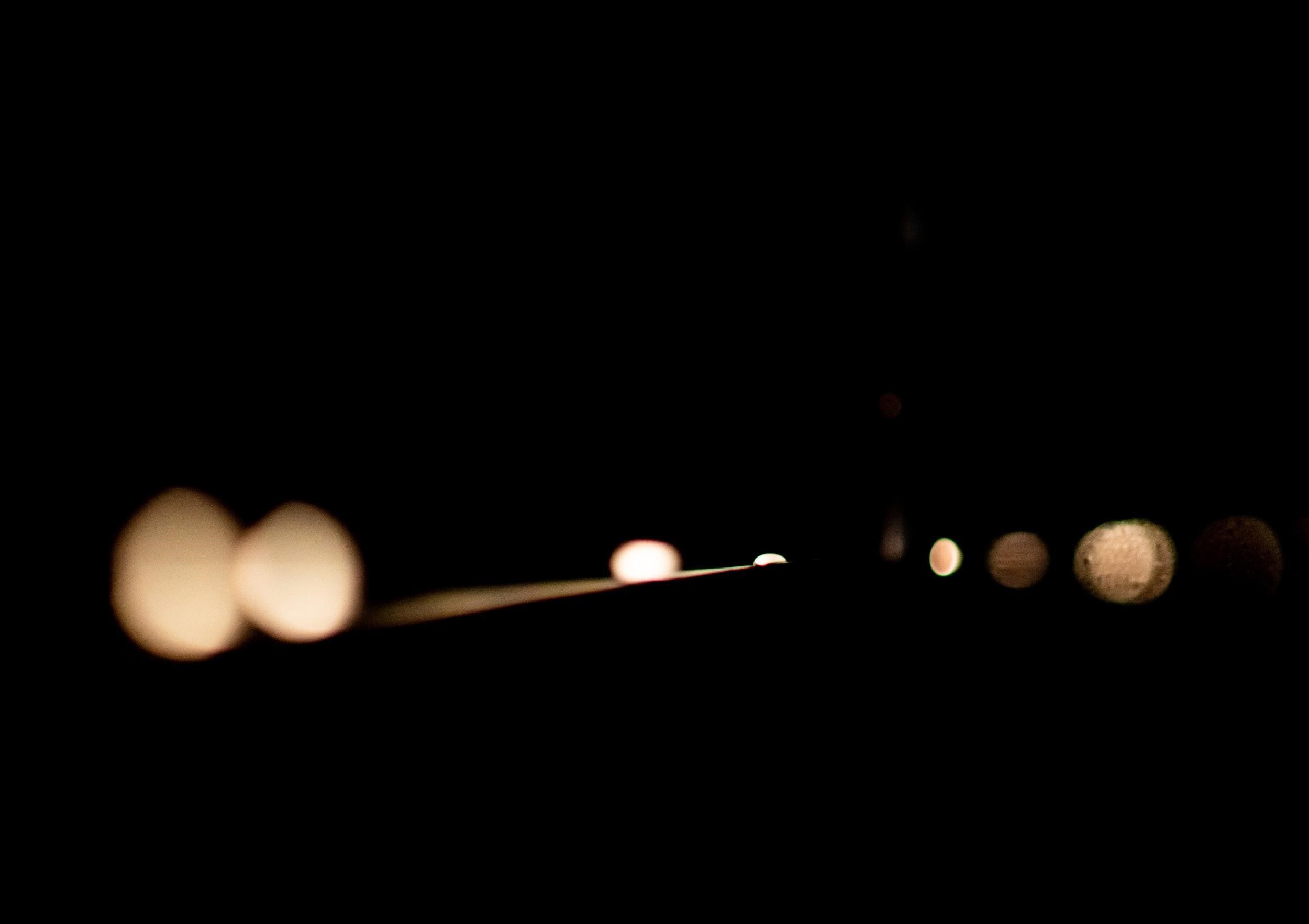 這個展覽共有兩組展品。伍韶勁的創作向來多以光和倒影為素材,這次在油街實現展出的《汩汩》亦不例外 —— 但這次加入他形容為較抽象的水珠和黑暗。「有時候,比較抽象的東西,較容易引起對非物質的反思。」在漆黑一片的展覽室中,你坐在只有兩個座位的木櫈,看著唯一照著地板的燈光逐漸黯滅。然後,眼前只會看見水珠來來往往,耳邊響起一下又一下的頌缽聲。忽爾間,外面的世界消失了,你當下的世界只剩下這些似有還無的感官刺激,整個過程持續約八分鐘,讓你徹底地從時間當中抽離。策展團隊解釋指,藝術家把整場體驗定為約八分鐘,是因為太陽的光線來到地球需要約八分鐘。「時間對光來說有意義嗎?藝術家希望觀眾可以在這個宛如宇宙的空間中,靜靜地反思和冥想。」