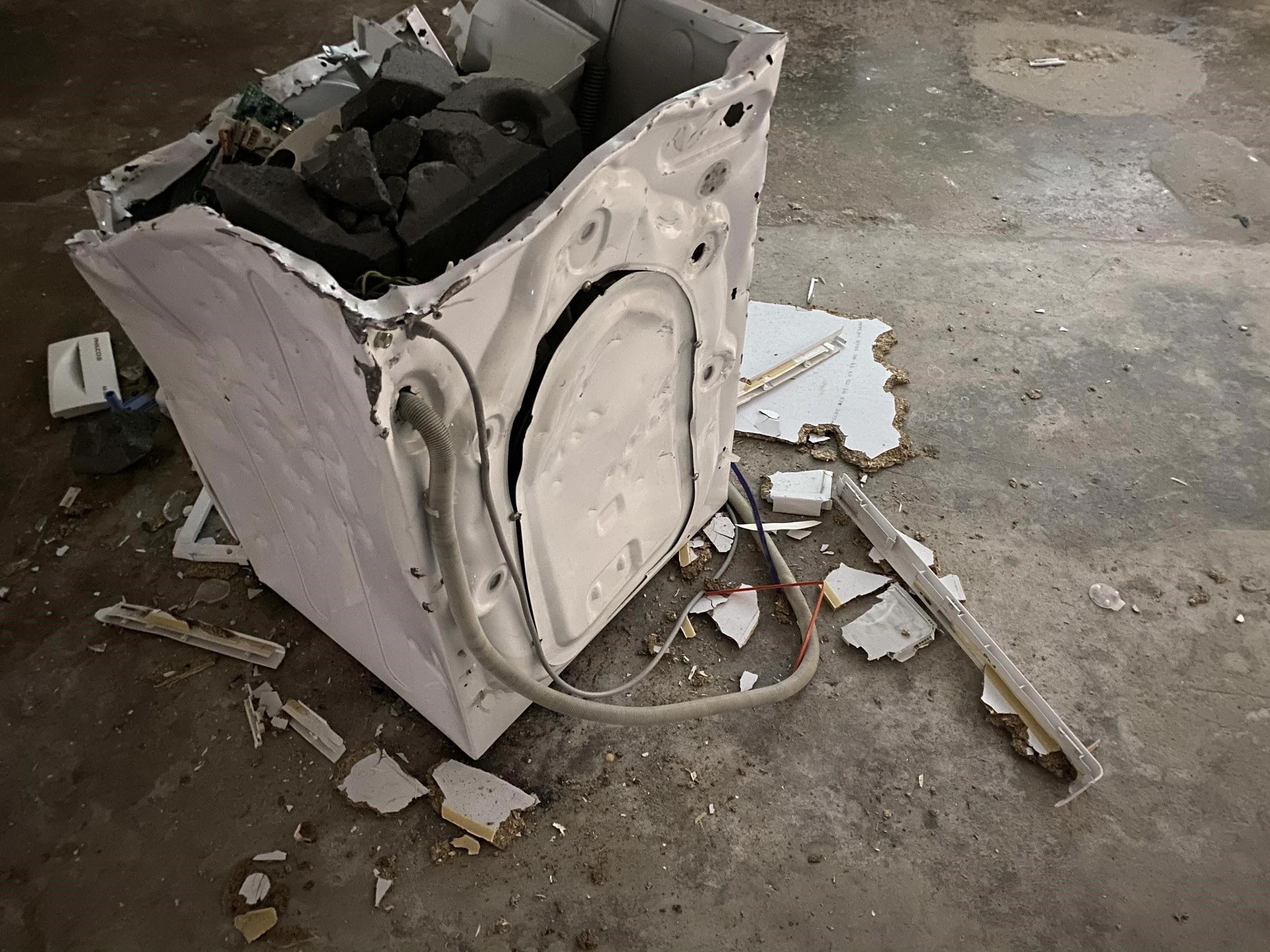 李傑的《香港花園》與我們認知中的花園很不同,在空洞的暗室更像是一片頹垣敗瓦。連美嬌解釋,散落於四周的都是常見的家居電器,營造出與平常生活有關的場景;加上展場內的紅磚牆充滿歷史感,甚有人去樓空之感。四周的影像、背景的敲擊聲,好像一錘一錘地敲打著觀眾的內心。「李傑利用空間去讓大家思考,當一切歸零後的錯落與傷感。」他沒有設定很具體的主題,讓觀眾透過個人的官能感受,從中領略與自己有關的反思。