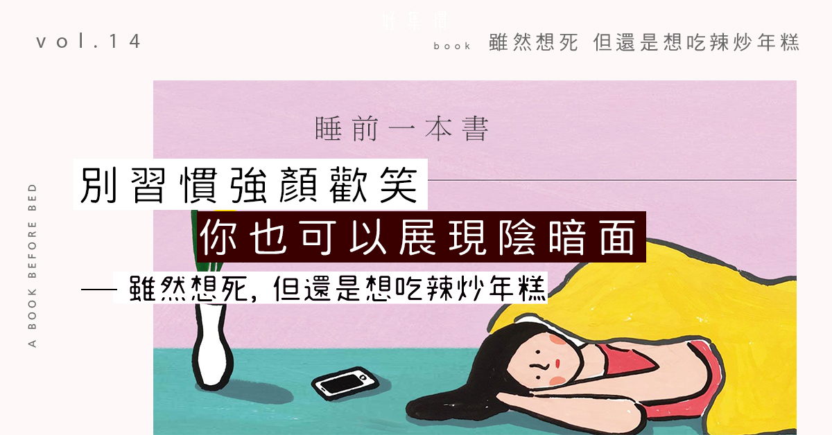 她把十二週的對話記錄下來,出了一本書——《雖然想死 但還是想吃辣炒年糕》,引起極多讀者共鳴。她叫白洗嬉,韓國人,就是社會裡原本最不起眼的人—— 會憂鬱地哭着入睡,但第二天醒來還是會強裝笑臉做人;會對某些人有強烈的厭惡感,但為了做好人也是會接受其他人的缺點;明明自己工作也很辛苦,卻不斷去聽別人吐苦水,彷彿很不應該拿自己的辛苦來跟別人比較……她說,自己就是有點憂鬱。