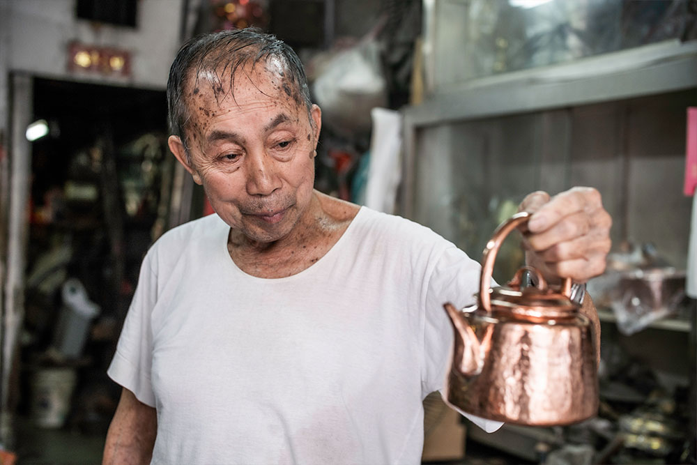 堅持大半世紀,陸樹才指近年開始力不從心,而如果自己退休,七十多歲的弟弟亦難以一個人繼續經營店鋪,故打算一年半載後,兄弟一起退下來,「可惜梗係㗎啦,幾十年嘅心血放曬落去,係呢豎又有啲朋友街坊,平時可以大家傾下計,依啲嘢如果退休之後就會消失,樣樣都化為烏有啦。」又伸手摸摸生鏽的機器,「呢啲『架生』當垃圾㗎啦,(店鋪)以後空框框、變成空地喇。」說畢,無奈地乾笑幾聲,鼻尖晾著的那副老花鏡背後,卻難掩愛惜和不捨。 請他拿幾件驕傲的作品用作拍攝,老人立即如數家珍,從櫃子拿出一件又一件的銅造水煲、茶壺、杯子,仿佛想要把整家店的一磚一瓦都留在相機裡。