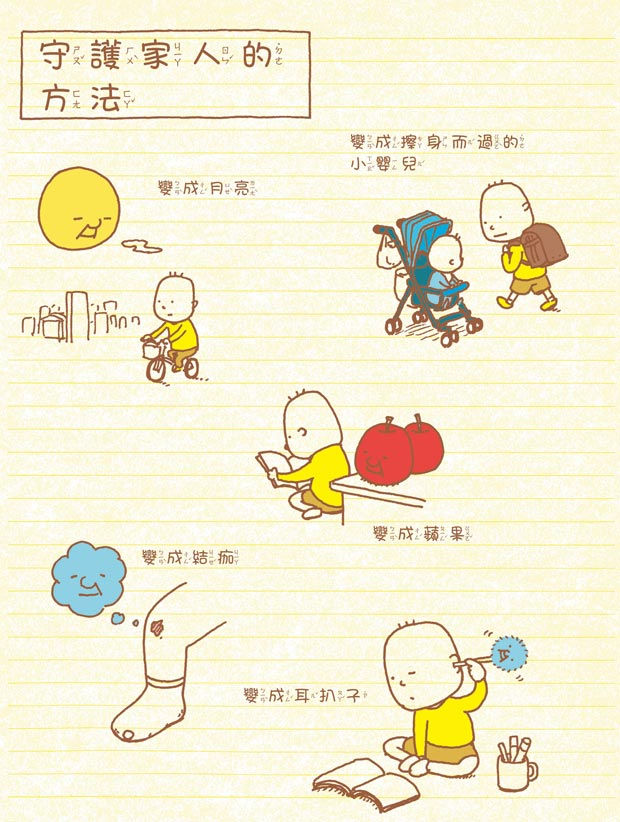 書中有不少細節莫名觸動我的心,例如爺爺去天堂,除了希望帶上好穿的鞋子、最喜愛的枕頭等個人物品外,還希望為天神帶上一瓶好酒、一些烤好的栗子和一幅難砌的拼圖。爺爺又列出各種可以回到人間探望孫兒的方法,例如成為月亮、一顆蘋果或果醬裡的匙羹;又或是化成一個被風吹起的膠袋,或一張在街上被派發的紙巾。