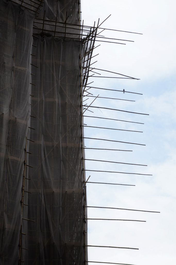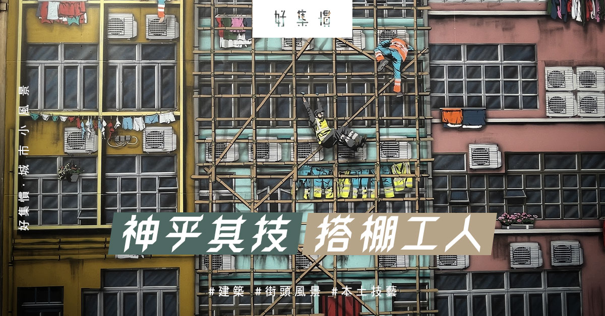 忽然說起,也是因為那天坐在咖啡店看到棚架工人工作,畫面幾乎跟壁畫一模一樣,工人在十幾二十層樓工作,像飛簷走壁也像特技人,神乎其技。不妨溫故知新,搭棚可說是香港一項非常獨特的建築技術,集工程學和力學於一身,據介紹那是創自「有巢氏」,源於樹上建屋技藝,工人不是什麼工程師,但懂得運用竹的柔靭性和結紥技巧,行內術語:棚架的直杆或立杆行內稱為「針」,橫杆稱為「軒」或「牽」,而斜杆或斜撐則稱為「倡」,以尼龍篾捆綁固定。好處是「快、好、省」,竹的成本相比鋁合金平,重量輕,容易搬運,搭建和拆卸唔好急,最緊要快。當然,行業最緊要安全,做足安全措施,最基本是開工時配上由肩膊套至腰部的降傘式安全帶、戴上安全帽、手套和防墮器,以避免意外發生。