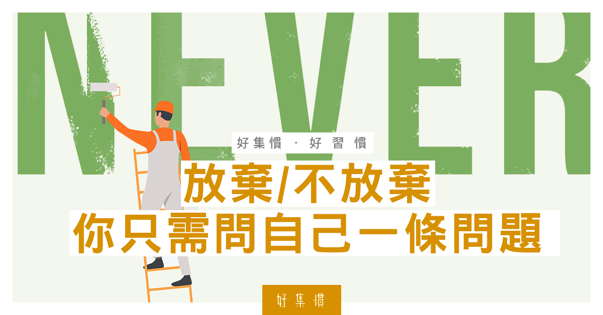 著名Self-help網站 Lifehack創辦人Leno Ho說:不是叫你隨便說放棄,甚至你亦很難知道是對是錯,但只需問自己一個問題: 我現在所作的事是不是能夠幫自己得到最想要的?(Is what I’m doing helping me get to what I want most?)看似很複雜,但舉個簡單例子你便明白:若你打算放棄一段感情,你便問自己分手是不是能夠得到自己最想要的?