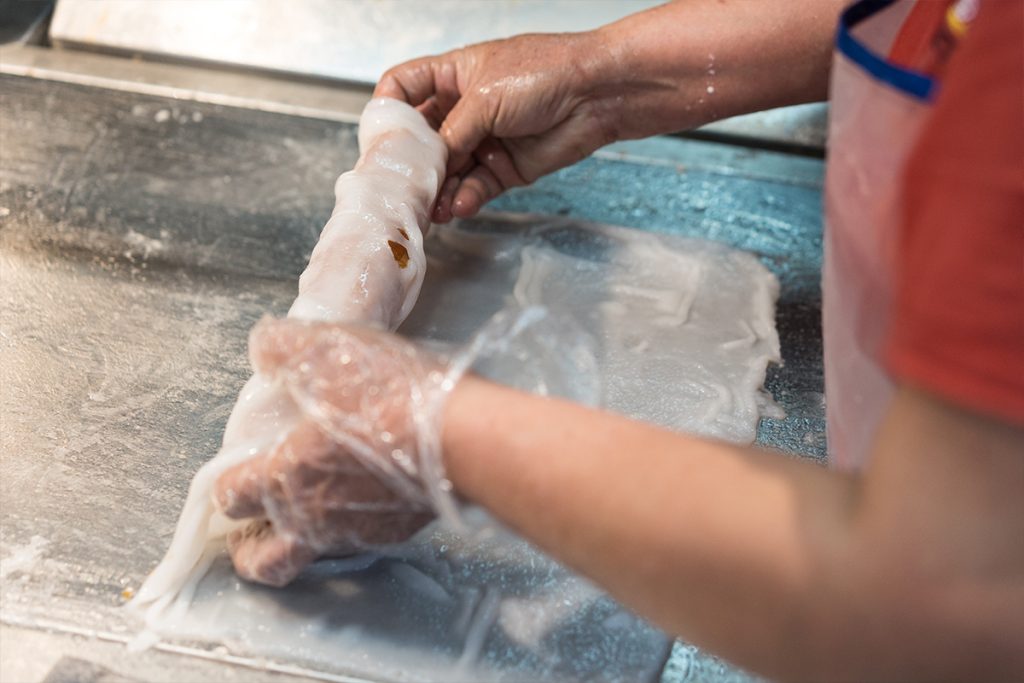 說一句題外話:近年不少foodie介紹腸粉時吃得眯起雙眼大叫:皮薄餡靚,又香又滑云云;事實上,如果你吃過傳統的布拉腸粉,便知道當中更講求米香,所以腸粉皮不會太薄(起碼透不見餡料),而要做到香滑,更是靠師傅一拉一推粉漿鋪得夠均勻;再蓋上蓋子,用蒸氣將粉漿蒸熟,之後放上各式餡料,每一口都吃到食材和米香的完美結合。而要再香滑一點,在腸粉豉油加一丁點豬油,別具滋味;池記的炸兩正是完美示範。