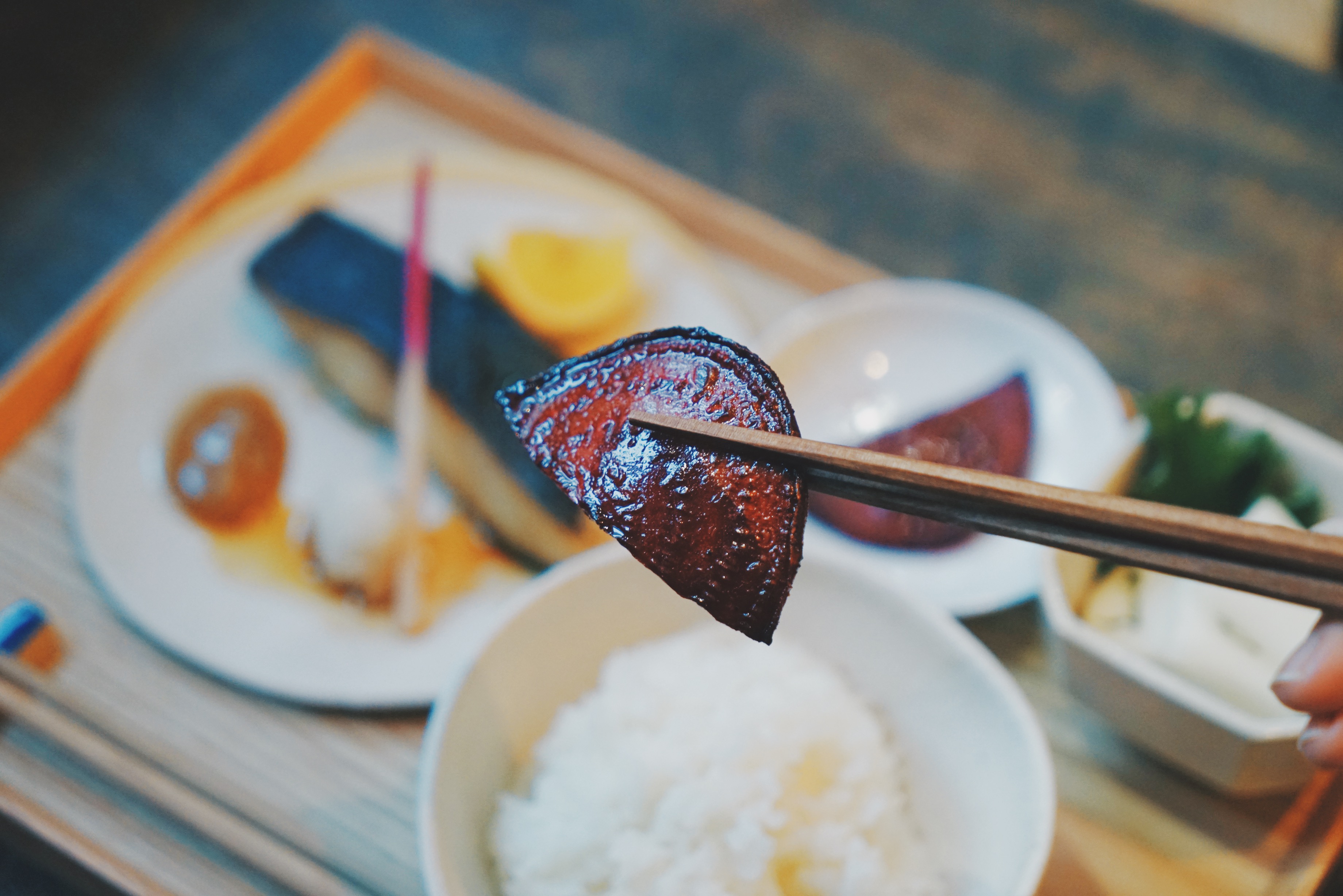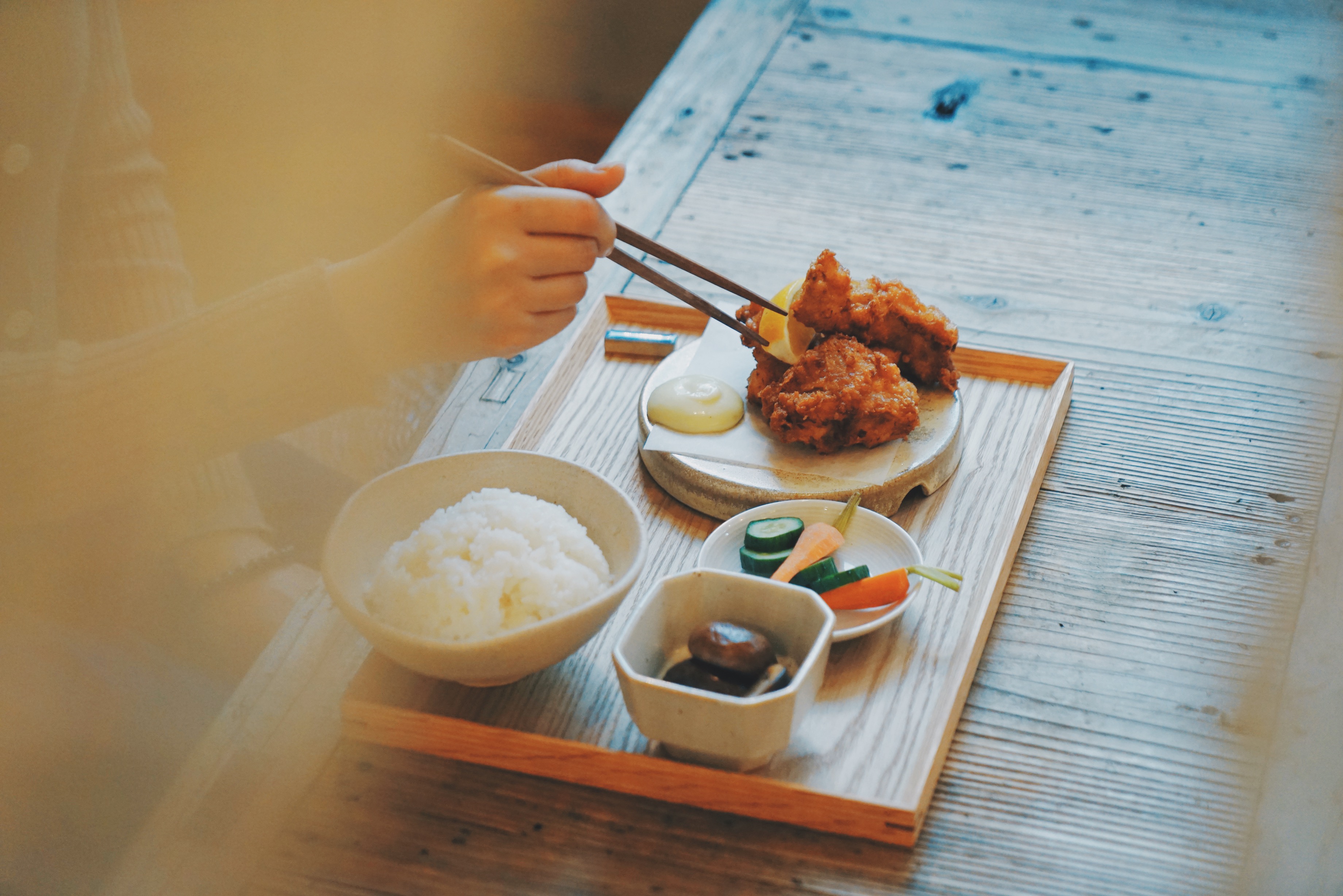 食物也展現了老闆對美感與味道的執著,請來了本港 omakase 壽司店武館老闆武師傅作技術顧問,每個定食都會有兩碟拌菜,有自家醃製的漬物,以及用本地菜所製作的小菜,吃得出的鮮味。用心製作的食物,配上由素謠製作的陶瓷碗具,吃一頓儀式感滿滿的飯,「當你有一個空間能夠好好專注進食,了解食物,那其實也就是一個檢視自己的過程,好好對待自己,與自己相處,了解自己的感受。」