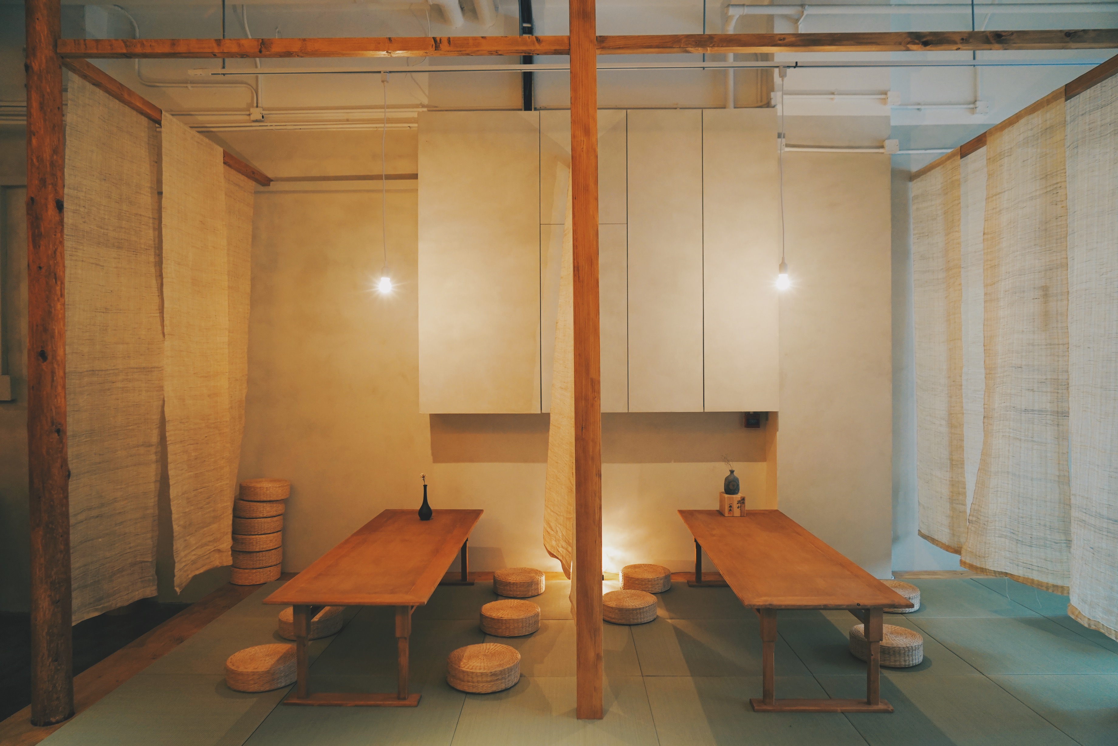 一走進悄悄,就好像隔絕了門外的世界,讓人忍不住放慢下來。挑高的樓底、水泥牆身、木柱搭配榻榻米、木桌木椅,在柔和的燈光下,藏著一種難以明言的溫柔,彷彿遇見了許久不見、親切的朋友招待一樣。