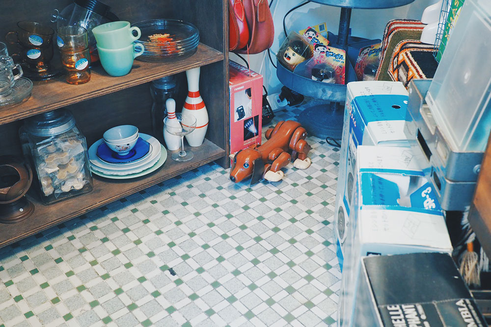 店內保留了綠色紙皮石,視線一直跟著地板向牆角延伸,就會清楚看見店內呈三角形。用不同的姿勢,如蹲下、水平、墊高腳都能找到不同的古物。