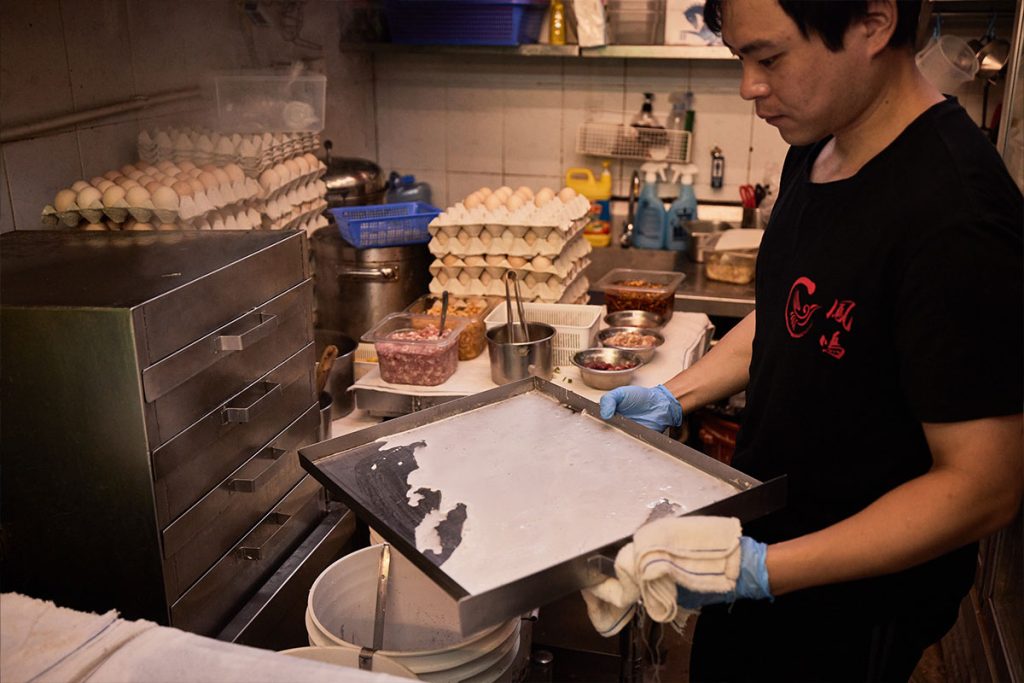 鳳鳴石磨腸粉在工場將米磨好後,便將米漿送到各間分店。祺師傅將油掃平蒸盤,把米漿倒進大鐵盤裡,加上蛋、牛肉等配料,不消一分鐘,香噴噴的腸粉便出爐,將自家製的醬汁淋在石磨腸粉的皺皮表面上,比一般布拉腸粉更掛汁,惹人垂涎。有的店舖會將石磨擺在店內讓客人看到,但祺師傅說,店舖空間細,加上容易有灰塵,所以他選擇將石磨放到工場另外處理。