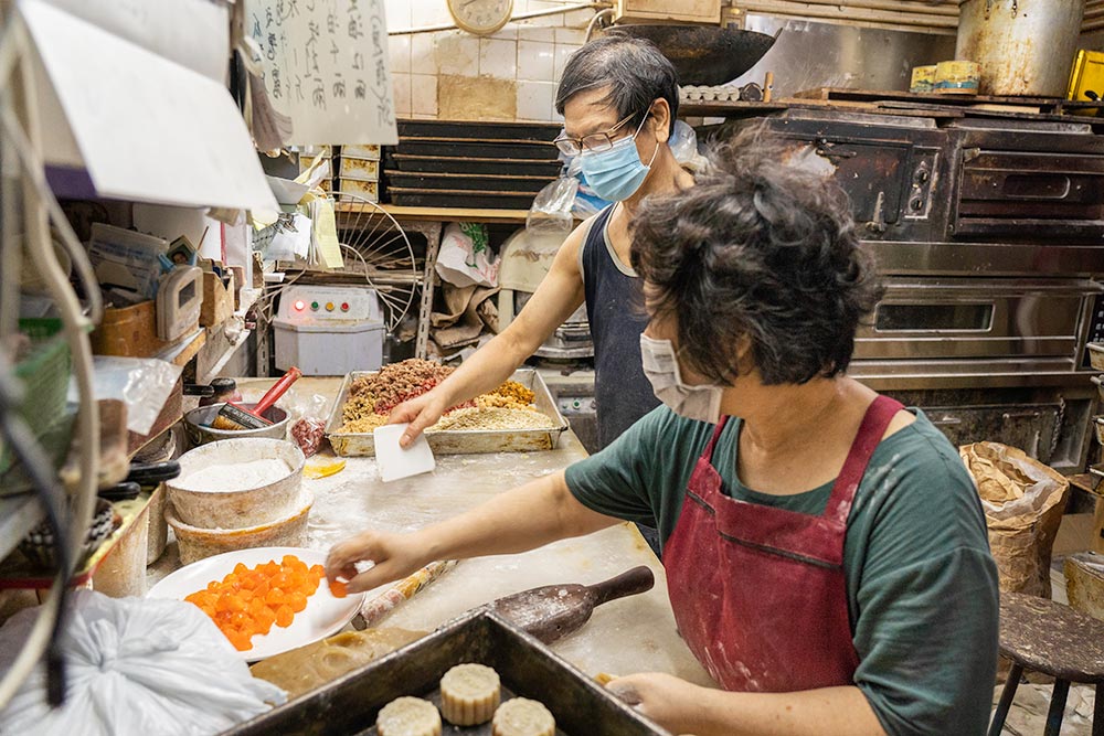 臨近中秋,店裡比平日更忙碌。每天入夜,夫婦二人便在店裡趕月餅訂單。他們賣的月餅屬傳統口味,卻依然變化多多:雙黃白蓮蓉、四黃蓮蓉、豆沙蓉、綠豆蓉、金華火腿、五仁,去年更研製了冬瓜蓉月餅。老闆娘說造月餅除了餡料,最重要的便是月餅皮中糖漿的稀稠度,「要烚到好似麥芽糖咁杰,皮先會造得好。」