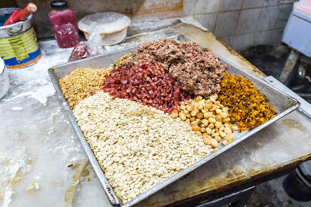 夫婦二人合作無間,一晚便能趕上百多個月餅的訂單。這晚他們一個負責造蛋黃白蓮蓉月餅、一個負責則拌五仁餡料。