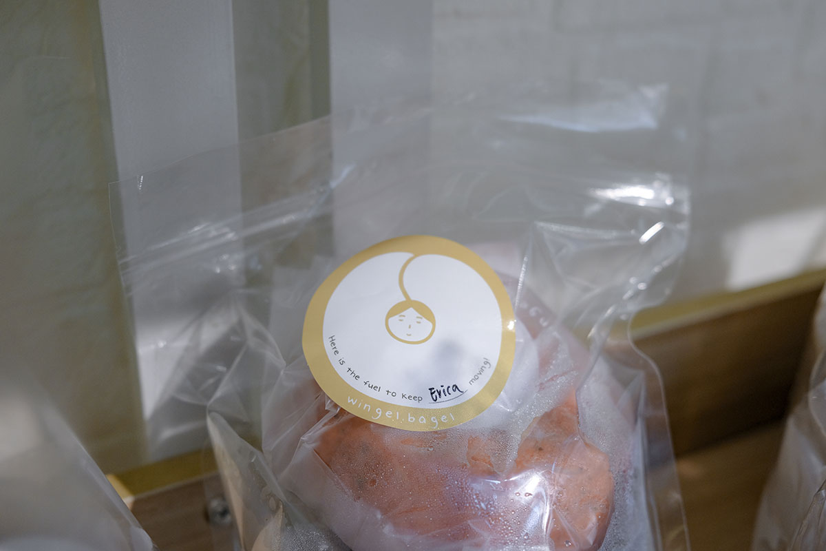 落單買貝果,確認電郵寫道:「Wingel 快要跳進你的肚子囉!」碌網店頁面,篇篇千字文正能量爆燈,看得人會心微笑。這樣的店主,想必是個樂觀熱血的長氣鬼。果不其然,親訪 Wingel Bakery 工作室,未見其人先聞其聲,一字記之曰「嘈」。是日任務為三百個貝果,Wing 在旁尖叫傻笑,發號施令。四個女生擀壓麵糰,捲入餡料,圈成環狀,落水燙煮,將新品「肉子燒(肉鬆玉子)」送進焗爐。夠鐘閉門訪問,眾人忍不住合掌調侃,終能耳根清淨。