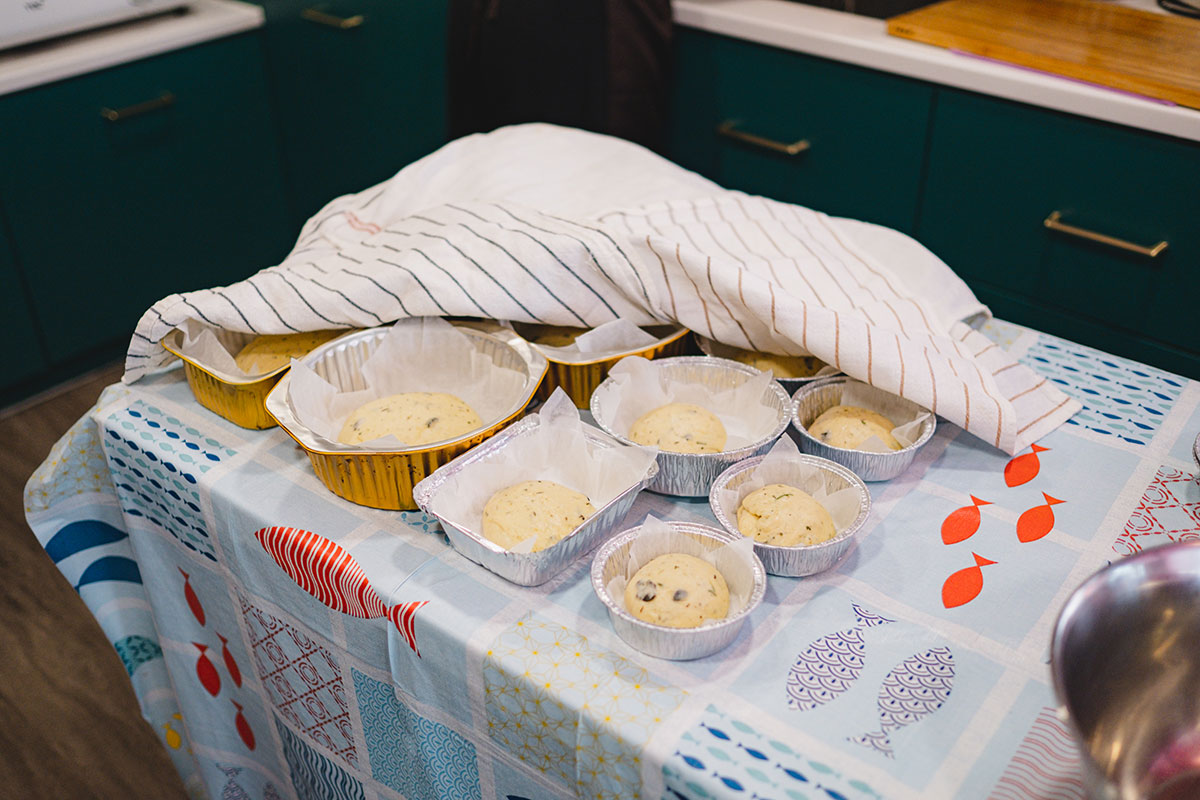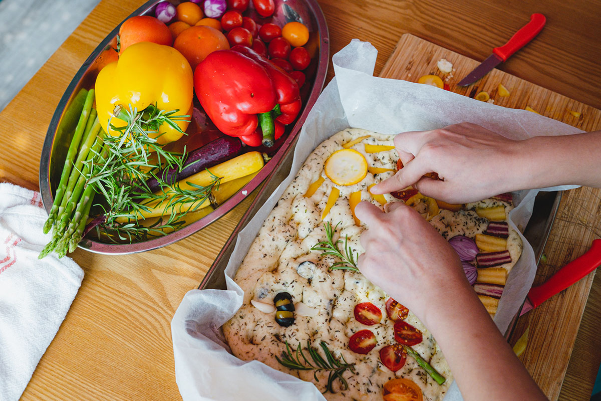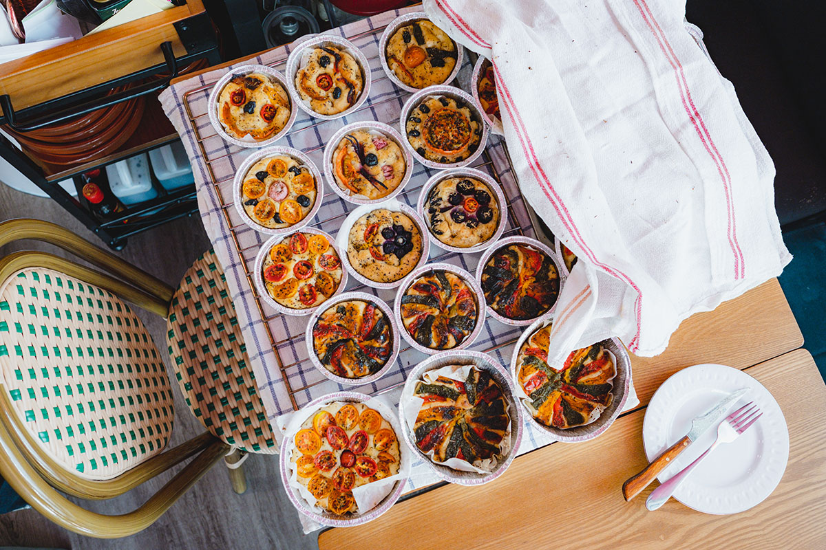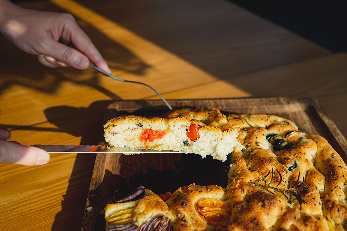 起初還擔心出品不夠大眾化,最終反應比預期好,還推出工作坊。當天她們為市集趕工,滿桌麵團拌香草橄欖油,搓好蓋濕布,發酵兩次,沿焗盤鋪平,抹油、灑鹽、加乾香草,再插孔,使其受熱時膨脹均勻。麵糰含水量高,色澤光亮。指頭初探,綿密輕柔而不黏手,還會回彈。黑綠橄欖相間加蒜片變蜜蜂,車厘茄刻幾刀成鬱金香,紫洋葱是花瓣,嵌在土壤,同呼同吸。