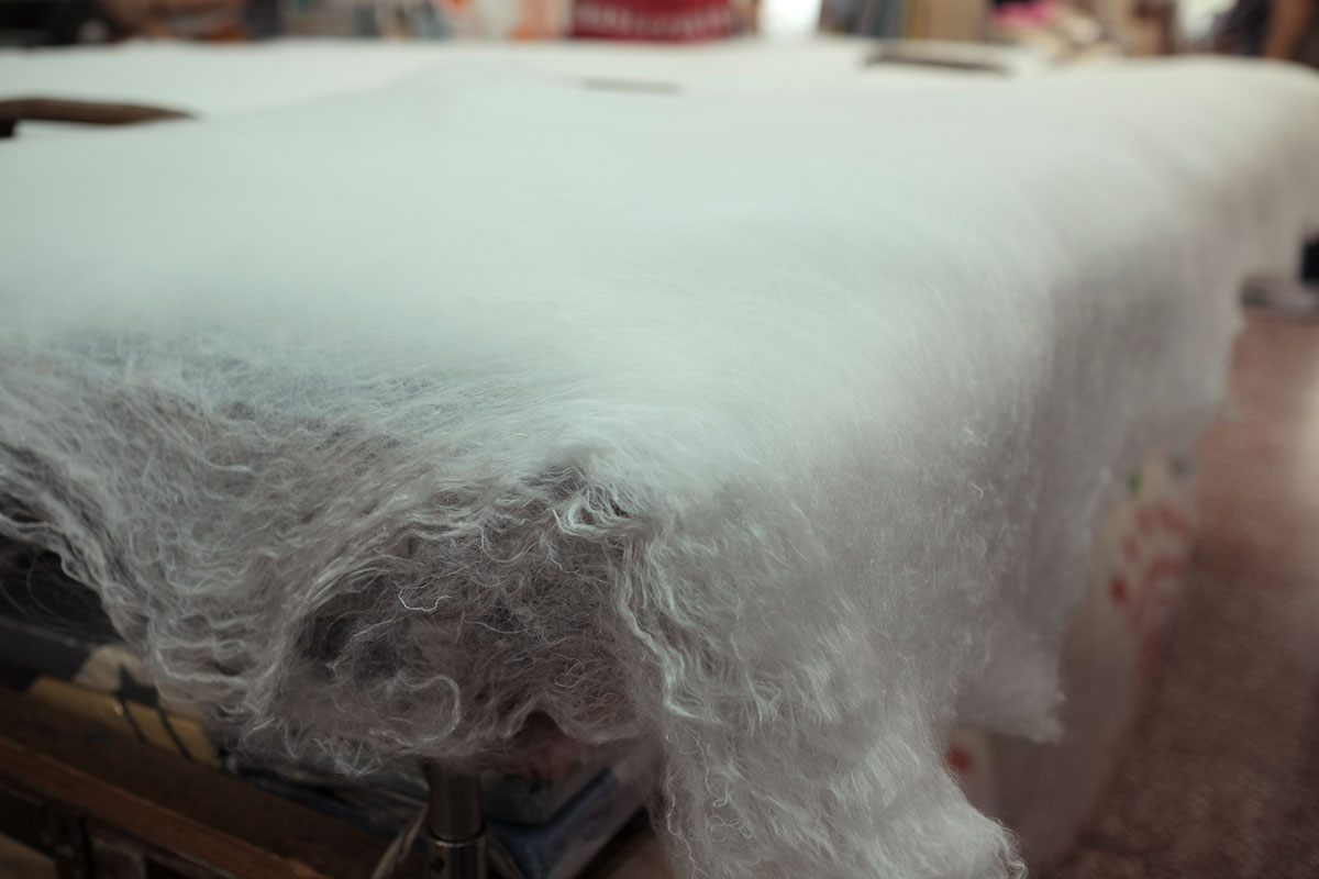 四姨林女士和姨甥女豆豆合力把手工蠶絲、俗稱「豬肚棉」拉鬆,一層一層舖滿在造被的工作桌上。絲棉像擱在枱上的白雲,伸手一摸,輕柔得甚麼都摸不到。