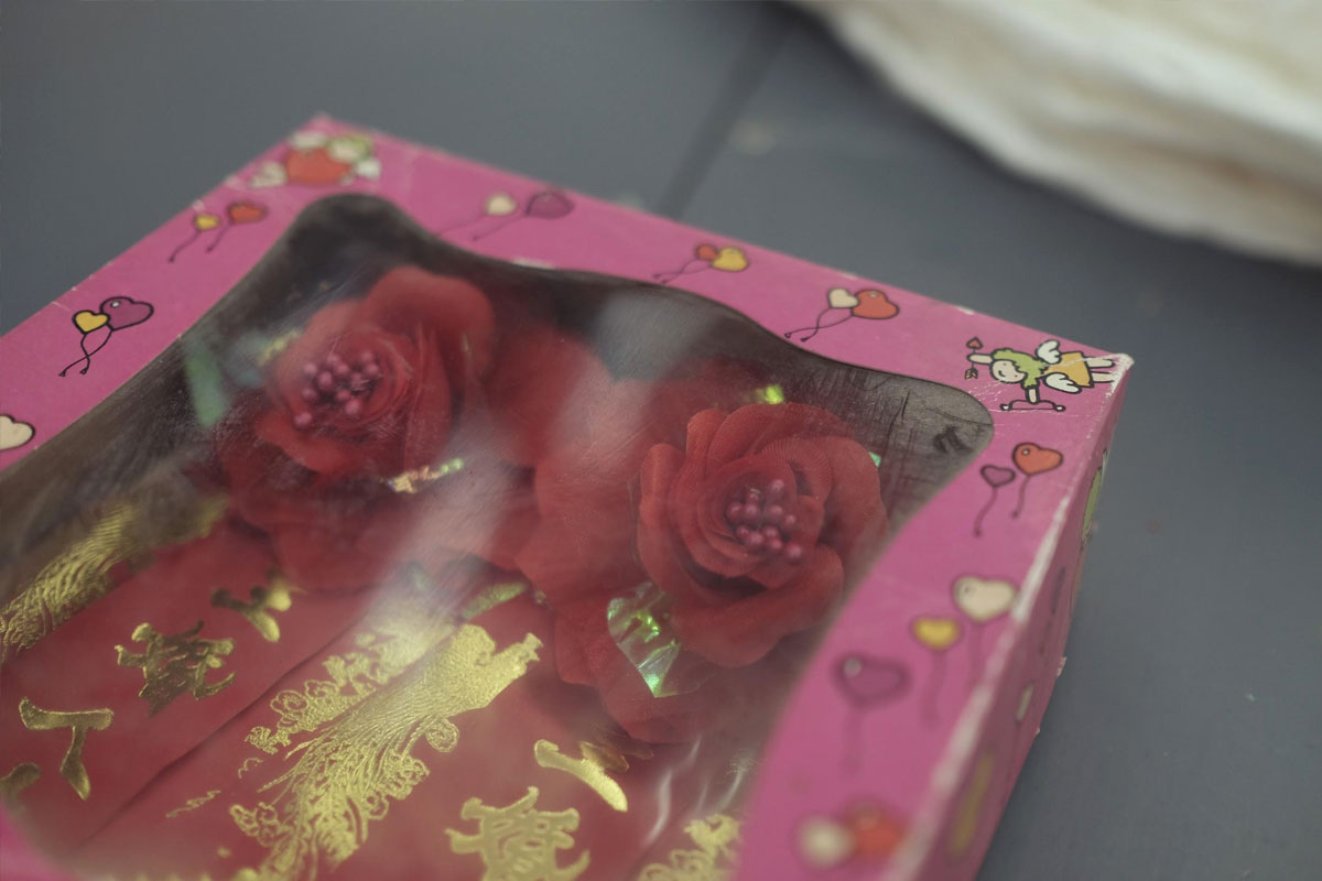 前年林女士把造新郎新娘襟花的機器全部棄掉,只留下幾個製成品。