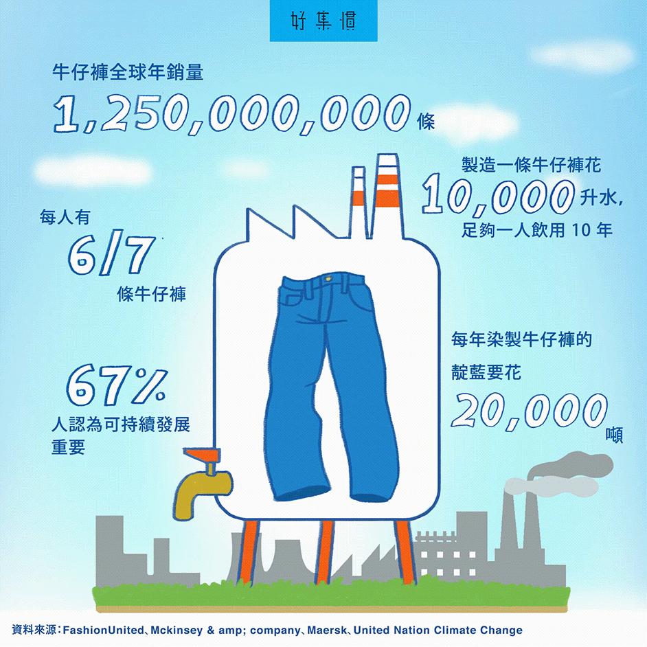 但不得不提,時裝產業從來是對水源污染的一大元凶,製衣過程中所使用的漂染,或有害化學品和清潔劑會嚴重影響河流和湖泊,從而影響環境和生態。看看插畫中的數字便會明白,單是要製成牛仔褲一公斤的棉花布料,便要花上 10,000 升的水,而 10,000 升的水足夠一個人飲用 10 年呢!當然,沒有人能完全零消費、清心寡慾,不過,何妨來學懂有「責任」地消費和懂得精明地做選擇?