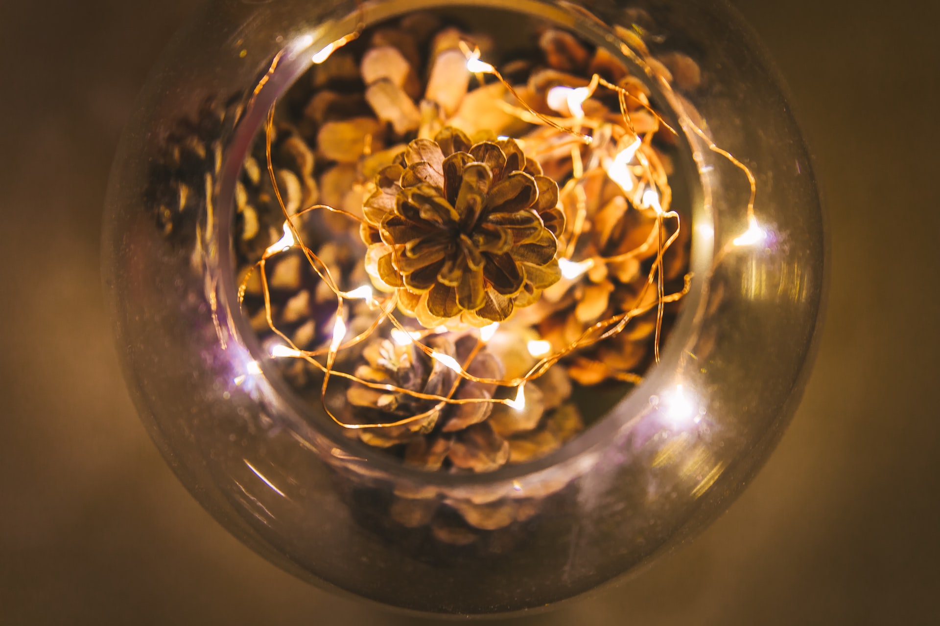 聖誕樹多用松樹製成,因此松果也是聖誕節的一大代表。找來一些比較大顆的松果,刮至中空,在裡面放置蠟燭,一盞平平無奇的蠟燭馬上多了一分聖誕的感覺。一家人在家共進聖誕大餐時,不妨點幾個松果蠟燭放在飯桌上,來一頓聖誕版的燭光晚餐吧!