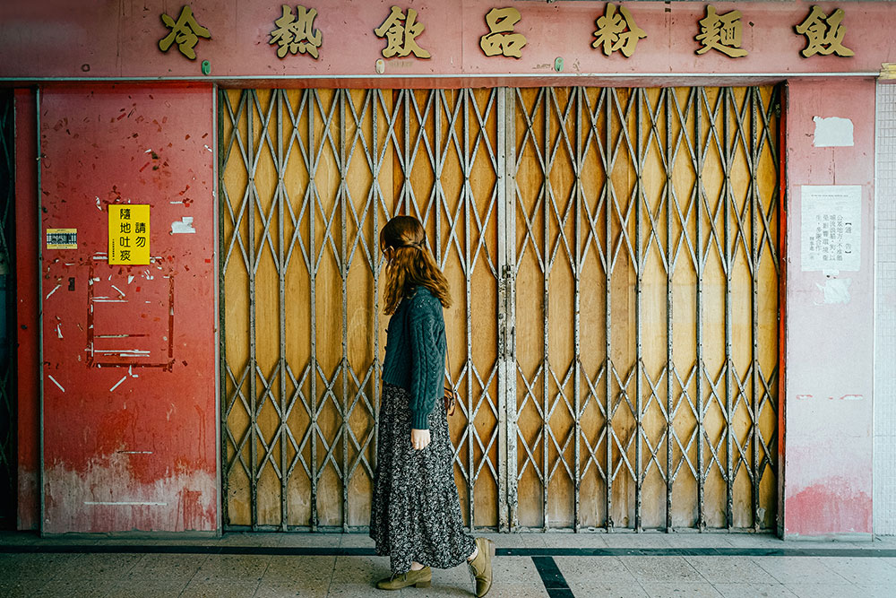 屋邨內許多店舖已經結業。走在其中,有種凝結時光的寂靜,讓人有人們從來沒有遠離的錯覺,只一個轉身,不知誰會拉開閘門,重現繁華熱鬧的景象。