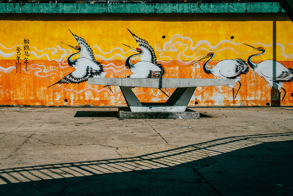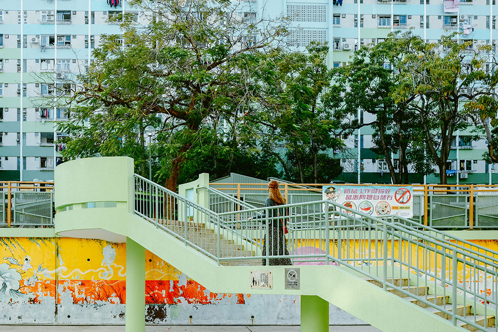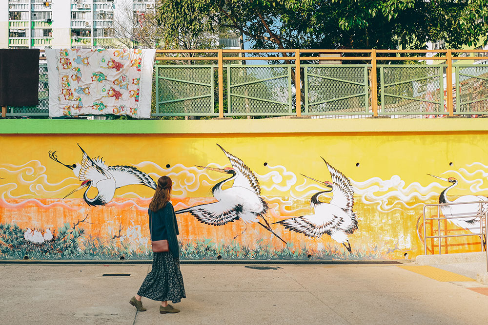 公共空間的牆上,塗滿了壁畫,這幅「松鶴延年」壁畫,與上面欄杆曬著有卡通圖案的被單相映成趣,有一種難以言喻的港式屋村美學在裡頭。