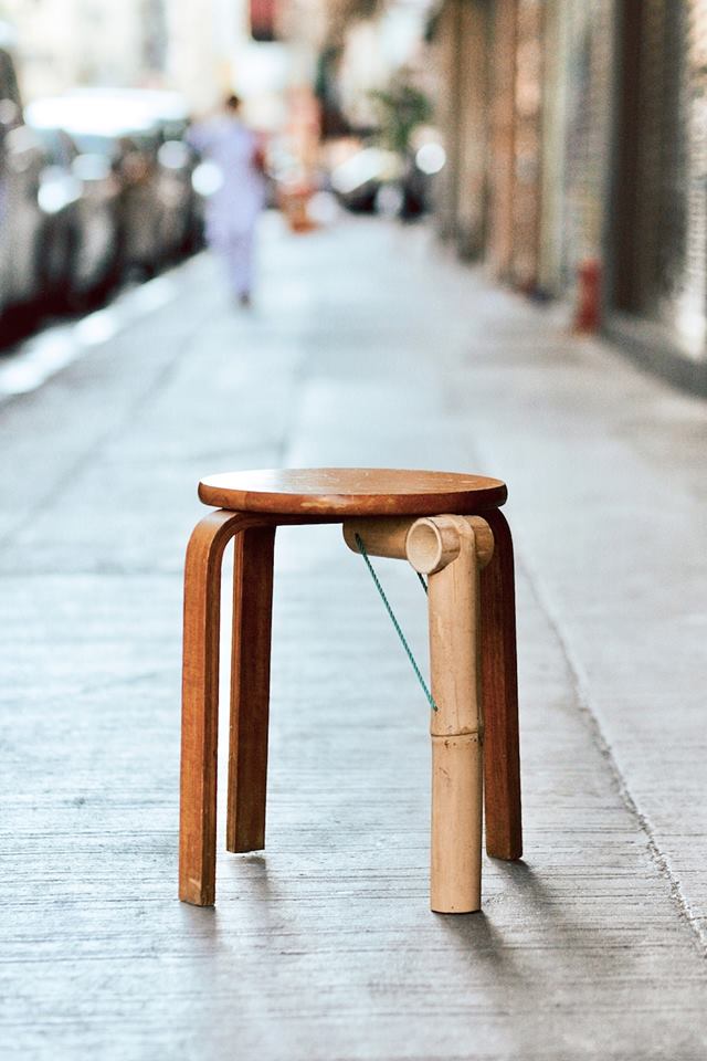 為了「舊竹製造」展覽,Kay 在街上找到兩張殘缺不全的椅子,再以舊竹修補。她憶述當時的製作前期有一段小插曲:她在街上看到一張只用尼龍繩當作靠背的「爛櫈」,正等待貨車來把櫈送走的時候,出現了一位伯伯想把她的櫈拿去附近的公園裡用。最後,她總算成功說服了伯伯「另尋別櫈」,但更重要的是讓他知道她想做的事情一點也不離地:「那時我才覺得安裝傢俱義肢是沒有錯的,公園裡真的有很多『阿叔』坐在這些櫈上看馬經、聊天,他們真的會用的。」
