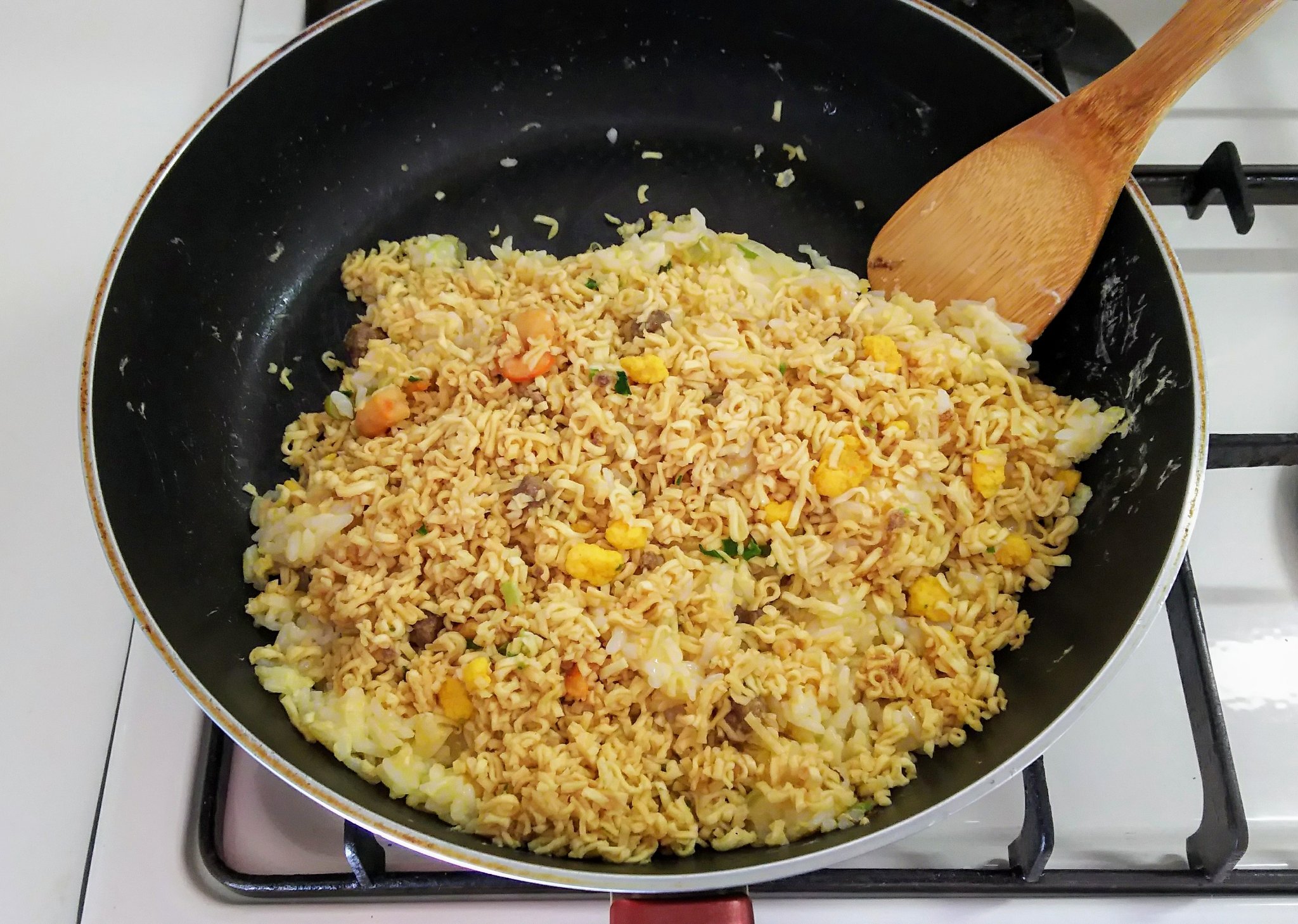 - 炒好飯後,加入杯麵、湯汁及葱花炒至乾身後便可。