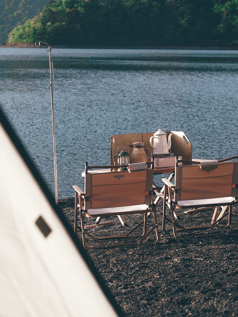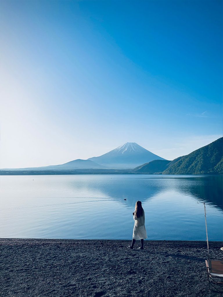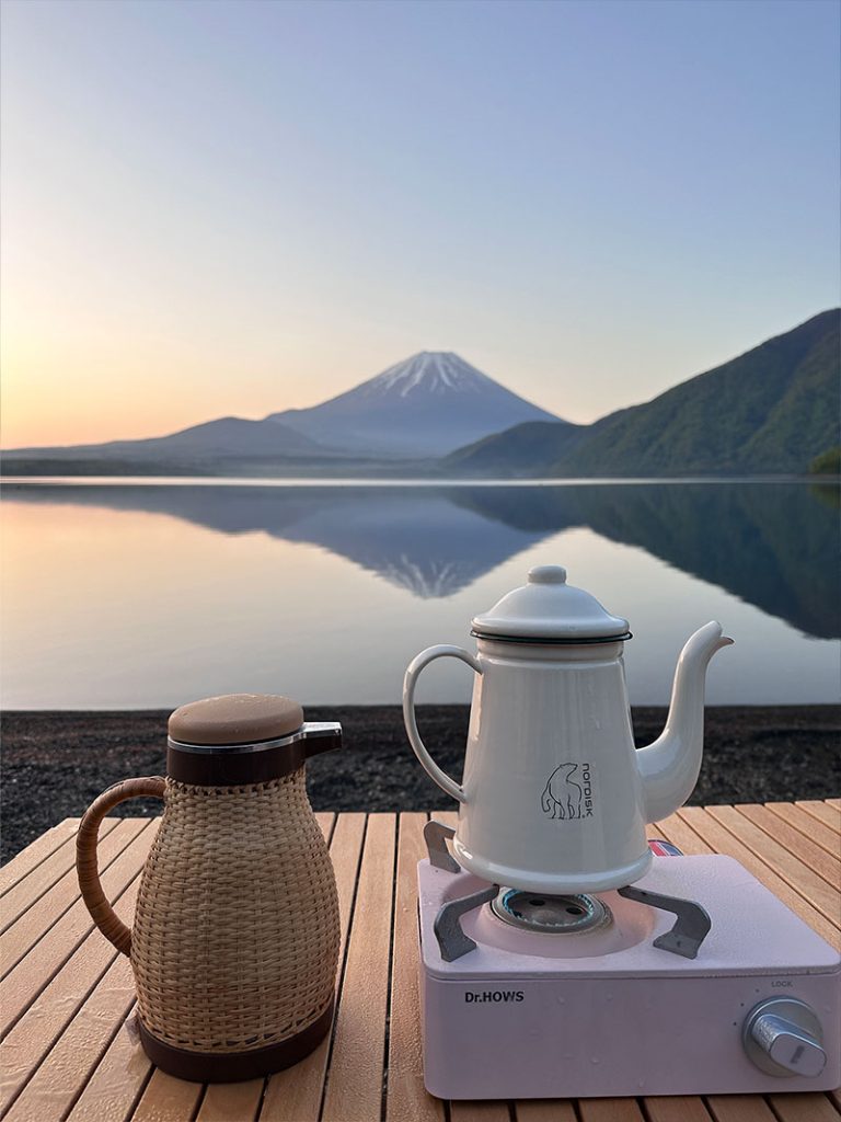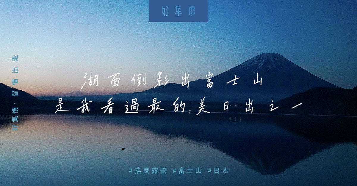 夜幕低垂,我們燒著柴火,伴隨月亮的光一直聊天到累了方才進營帳休息。設好了日出前的鬧鐘,想要看看日出的富士山。早上4點,鬧鐘響前便醒了,帶著期待的心打開營帳,眼前的畫面比我預期的更要震憾。天還沒亮,隱約的看到富士山就在那。不對,是兩個富士山,靜謐的湖面一點波濤也沒有,清晰如鏡面般反映了整個富士山。我們馬上拿了兩張椅子和一張桌,靜靜的凝視著這個畫面,直到太陽從左邊升起照耀整片湖面,這是我們看過最美的其中一個日出。