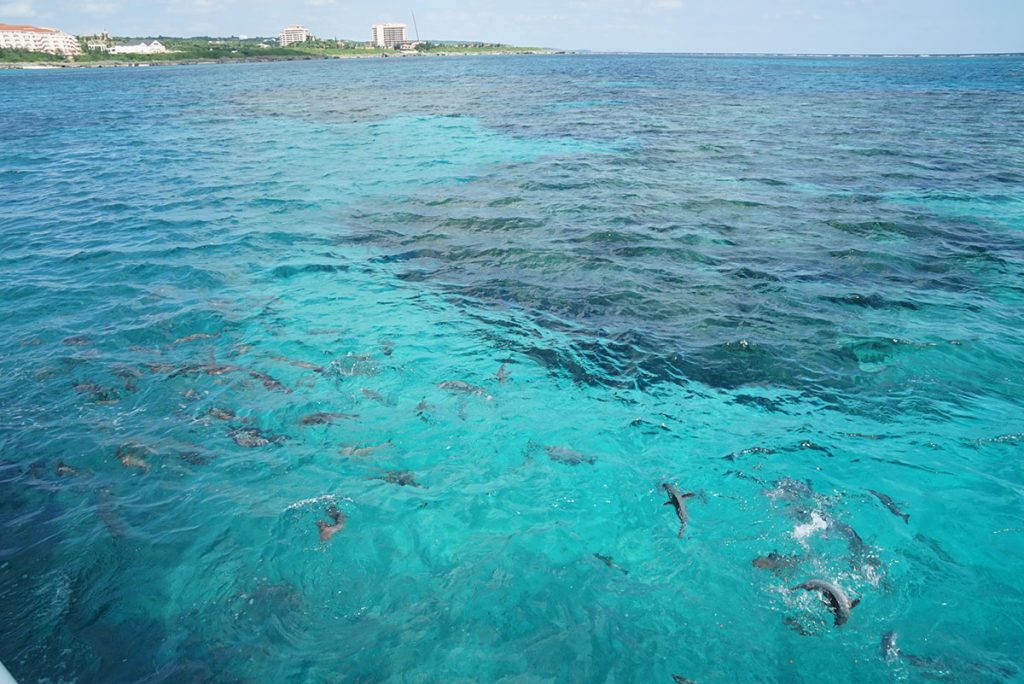 透過玻璃窗觀看宮古的海底,大部分是硬珊瑚,是熱帶魚及海龜的最佳棲息地。船隻沒有嚇走魚兒,偶爾有一兩條大魚游過,更多的是大群小魚們,好奇地游近窗邊。大大小小的魚在船外伴遊,像觀看《魚樂無窮》般有趣。在珊瑚及岩石的隙縫中,還隱約有些蝦蟹害羞躲在其中,幸運的話,還可以見到海龜出沒!
