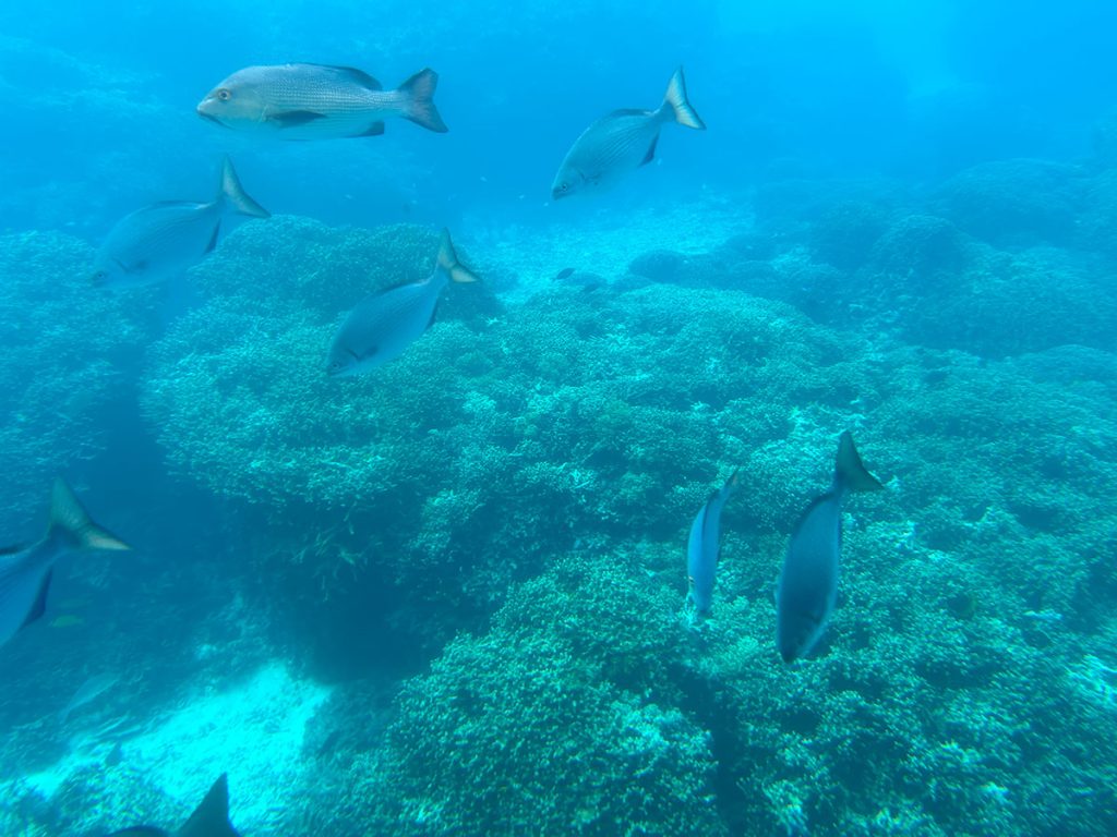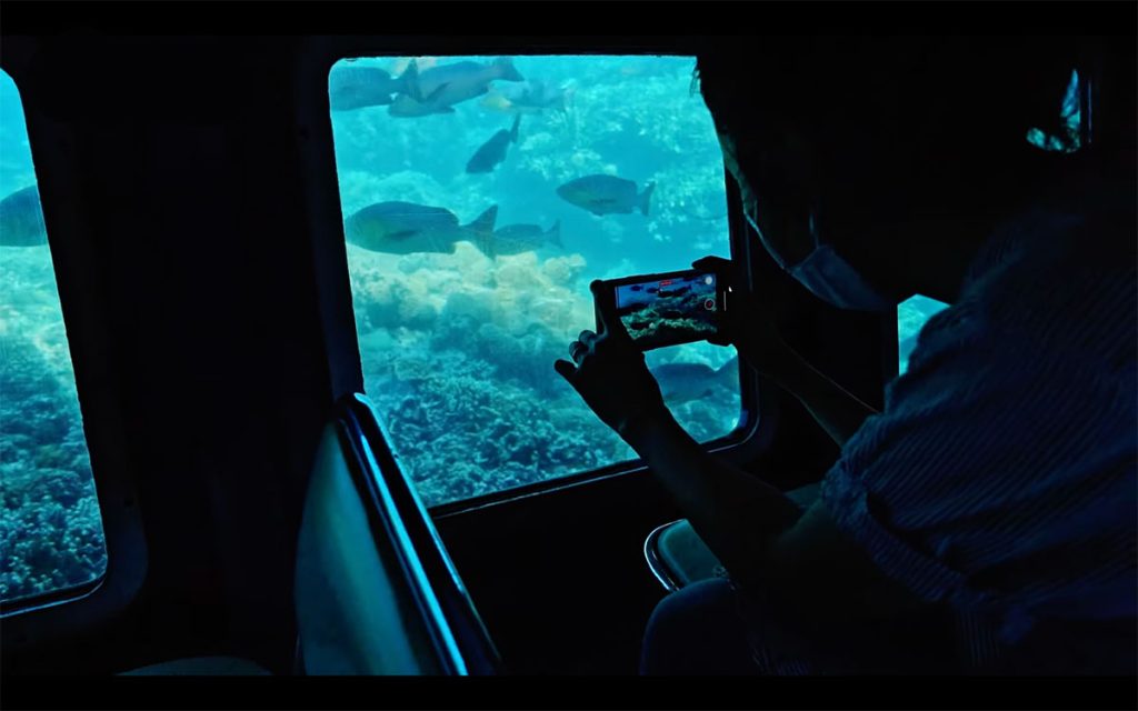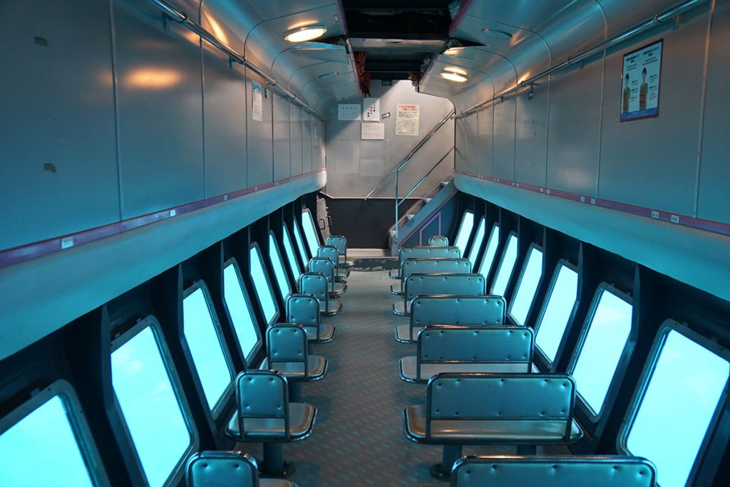 白色小船有圓型船頭,有點像迷你潛水艇玩具,可載60名乘客。船隻慢慢駛離避開港,平靜無浪的海面放眼望去,盡是海天一色,風景絕美,難怪常說看海有療癒作用。出海途中船員呼喚乘客可前往下層,兩邊座位旁邊都是玻璃窗,向外望就是25米的水底,看著風景慢慢改變,驚喜也隨之而來。