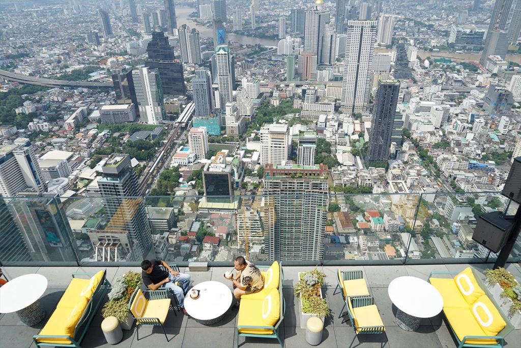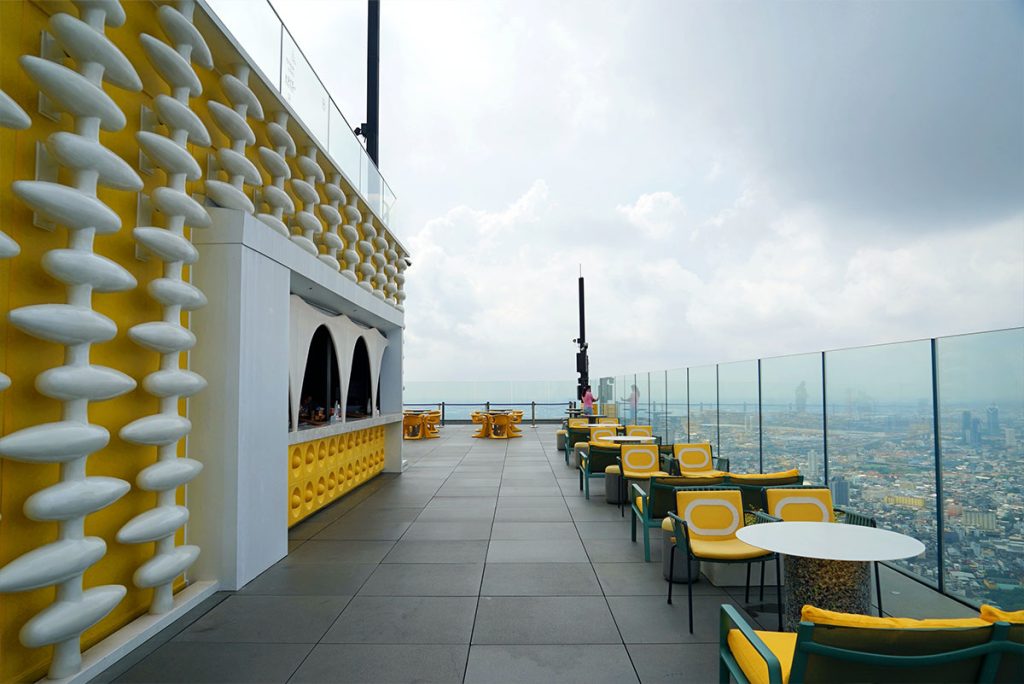 在75樓轉乘透明電梯登上78樓,來到310米的全露天瞭望台,這裡同時是曼谷最火紅的天台酒吧Sky Beach所在樓層。天空彷彿伸手可及,望出毫無遮檔的玻璃窗外,曼谷360度城市景致盡入眼簾,地標如昭拍耶河、摩天輪及全市風光都能同框看到。天台中央是鮮黃配白色為主調的酒吧,讓人在空中以美景伴酒,享受美好的歡樂時光。