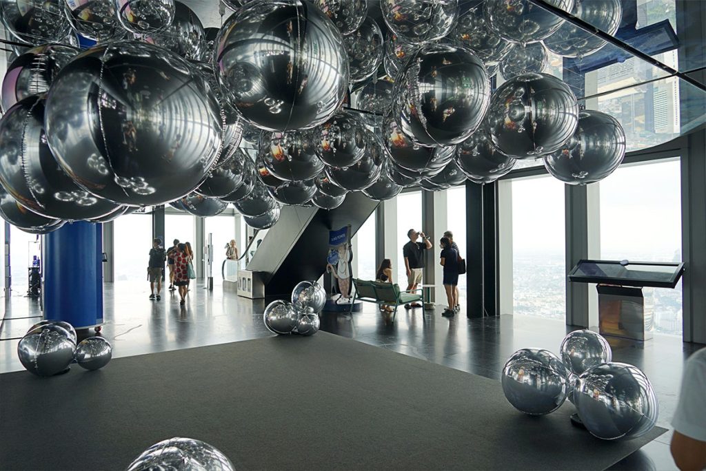 King Power Mahanakhon SkyWalk 有多層瞭望台,進入全泰國最快的高速升降機,被夢幻的動畫片段包圍,像進入了另一個空間,只需50秒就瞬間抵達最高層。74樓的室內觀景台設氣球、雲朵等藝術裝置,在天氣變幻莫測的曼谷,戶外部份即使因雨天而關閉,亦可在此打打卡,躲在室內欣賞城市美景。