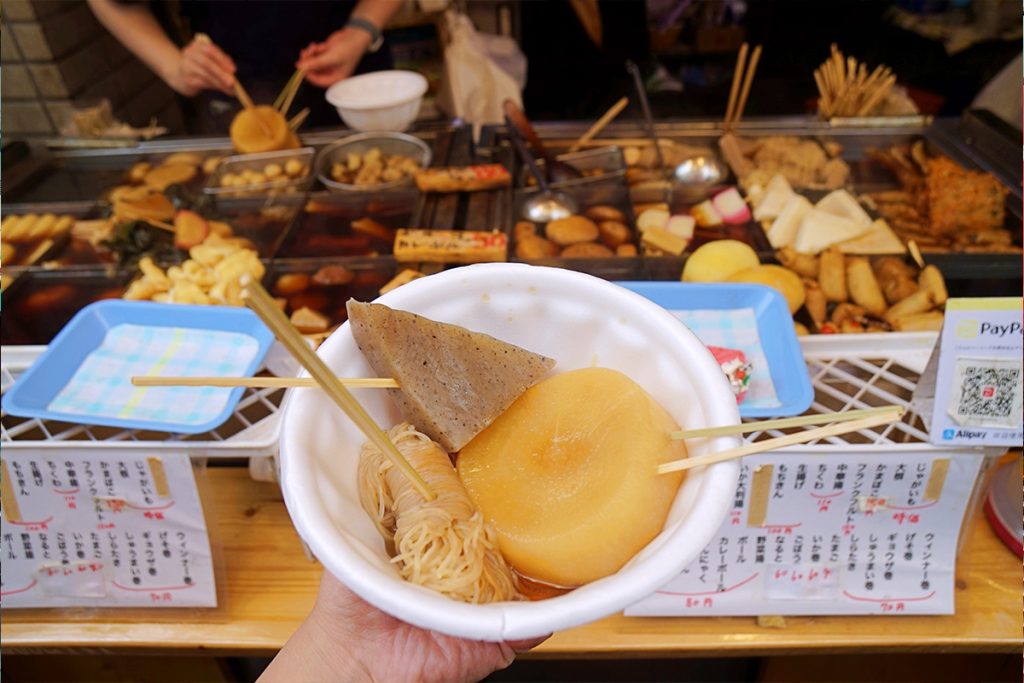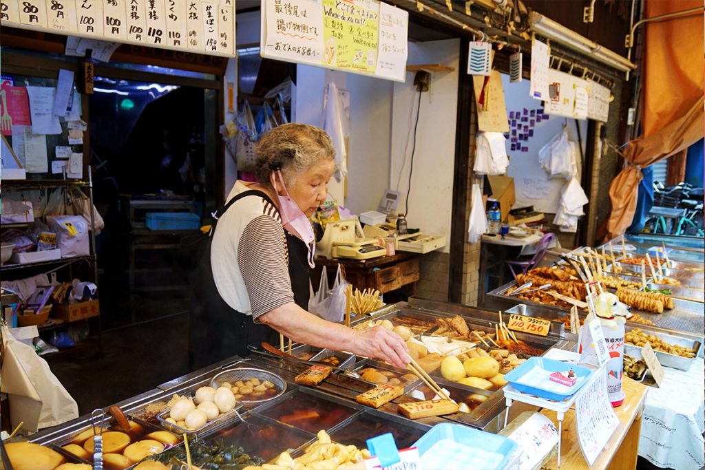 「增英蒲鉾店」是售賣魚板的專門店,主打熱騰騰的關東煮,數十款蘿蔔、竹輪、雞蛋等食材,浸泡在濃濃的醬油湯中,染上一抹吸引的微啡色,讓人選擇困難。店主熟練地將一件件煮至入味的食材,逐件放入膠袋中,最後淋上高湯,將這道國民家常美食帶回家。