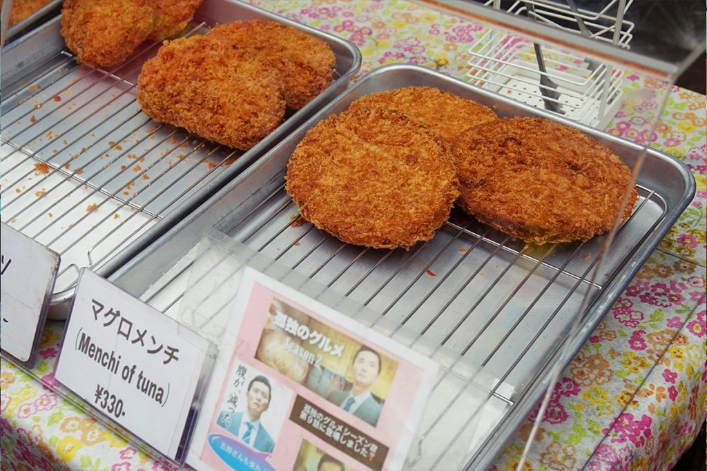 站在「手作店Sakai」攤檔後的婆婆,不忘推介她們店家自豪的吉列免治吞拿魚餅,還有用舊式電飯煲炆煮的牛雜。店外還放置了一張長木櫈,讓食客可以坐下慢慢享用,還好奇地詢問陌生面孔「從哪裡來」、「味道好嗎」,溝通靠簡單會話手語,人情味不會因言語不通而減退,是百貨公司所欠缺的交流互動。