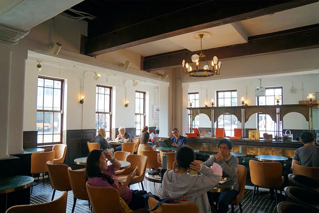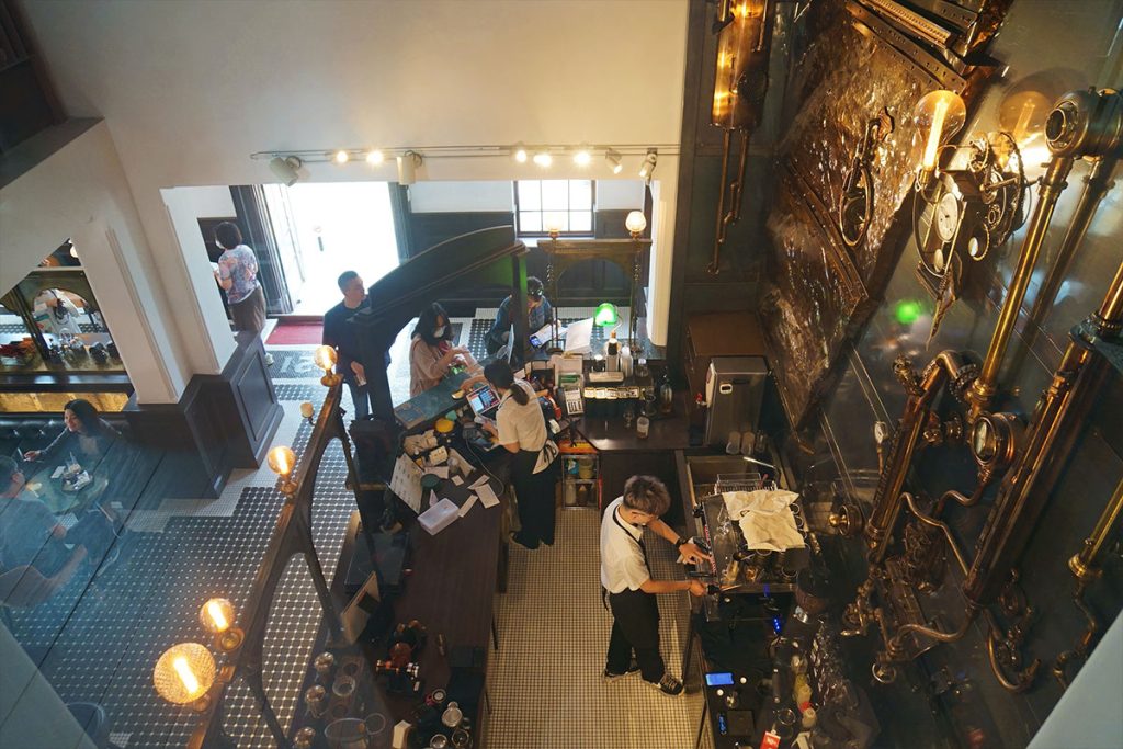 整個咖啡吧後則以蒸氣龐克風格設計,呼應這一帶以往的輝煌工業歷史。牆身貫穿兩層,金屬感的機械黃銅管、氣壓計等裝飾有型獨特,用餐區的黑白階磚地板、古典絨布座椅,意外地跟室內堂皇氣息相配,安坐其中,很有穿越時光隧道的錯覺。
