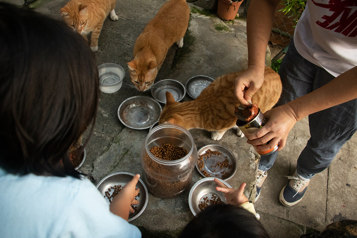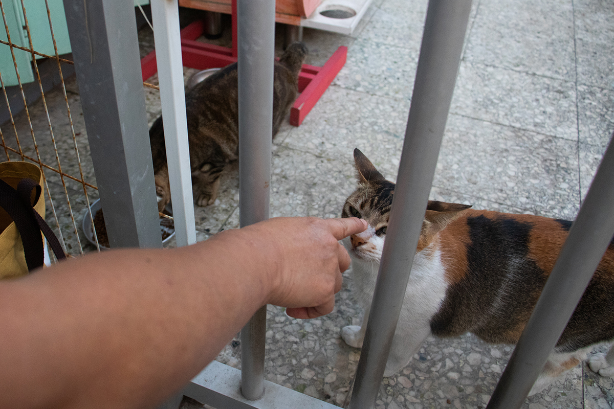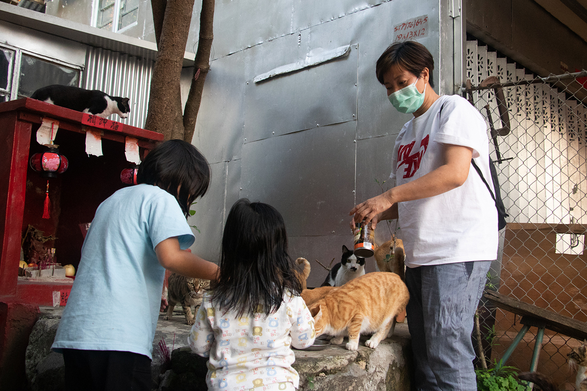 走在路上,沿途貓兒都認得 German,知道是時候開餐,喵聲此起彼落,一拿貓糧出來,廿隻流浪貓立刻圍著食物,吃得津津有味。German 幫每個流浪貓都取了名字,知道牠們所需,熟練地捉住其中一隻,餵牠吃藥。她指,因為有些貓只會在晚上出來,所以她一天需要多次餵流浪貓。