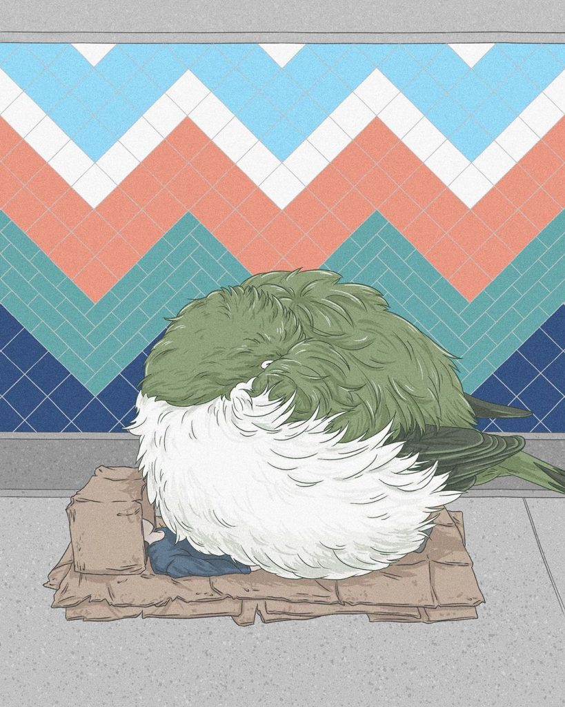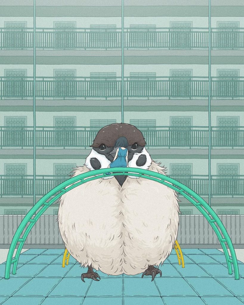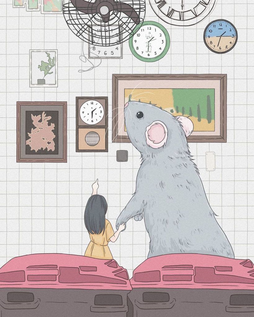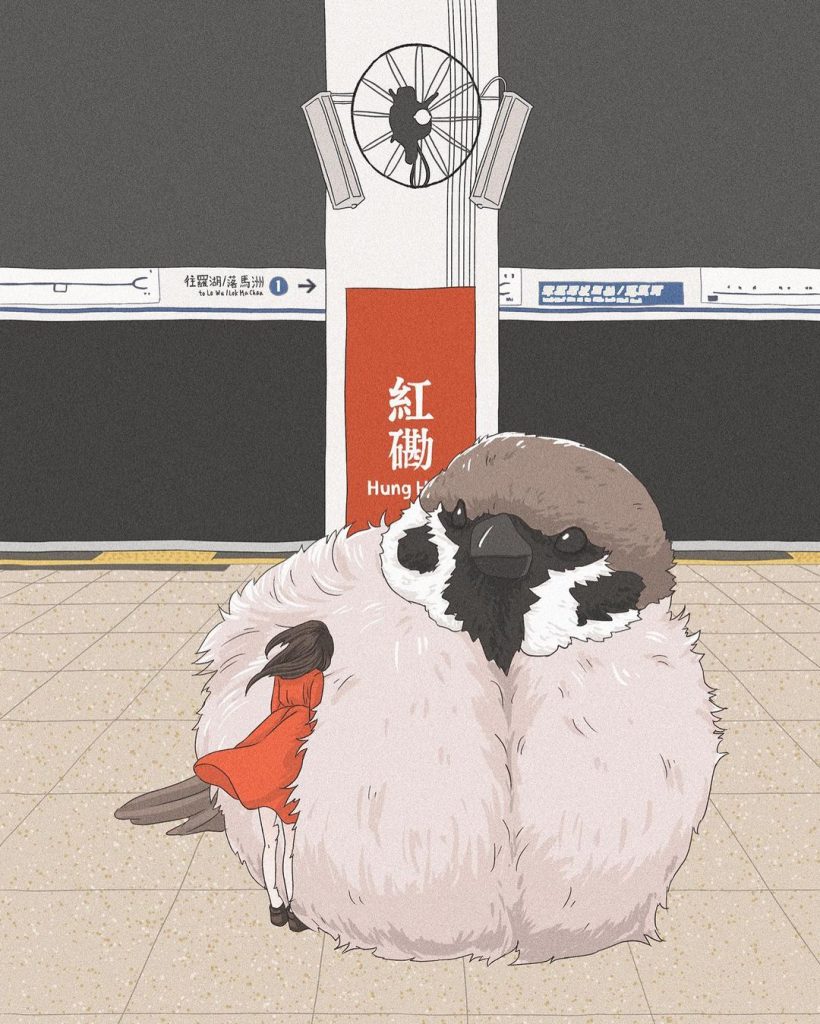每一幅可愛畫作背後都有一個故事在裏頭,譬如飛鼠與勵德邨的結合,只因香港傳言正方形或圓形的房屋設計會令人不禁有跳下去的衝動,「有段時間情緒很差,想像如果自己跳下去會否有一隻飛鼠來接住我呢?」又如去年五月,東鐵綫紅磡站舊月台完成47年的使命,她隨機選擇了人見人愛的麻雀,誰知有朋友私訊表示很感觸,因為紅磡站的麻雀特別愛吃站內M記的剩食而特別肥大,令她在不同人身上聆聽到有趣的故事,帶給她意外的得着。