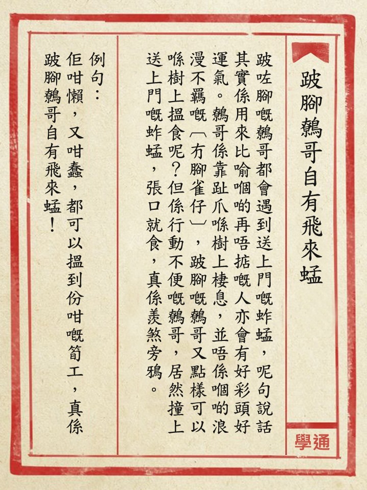 意指跛腳的鷯哥也會遇上送上門的蚱蜢,比喻再唔掂的人,也會有好彩頭。盼望大家在艱難時,也能發掘生活中的小確幸。