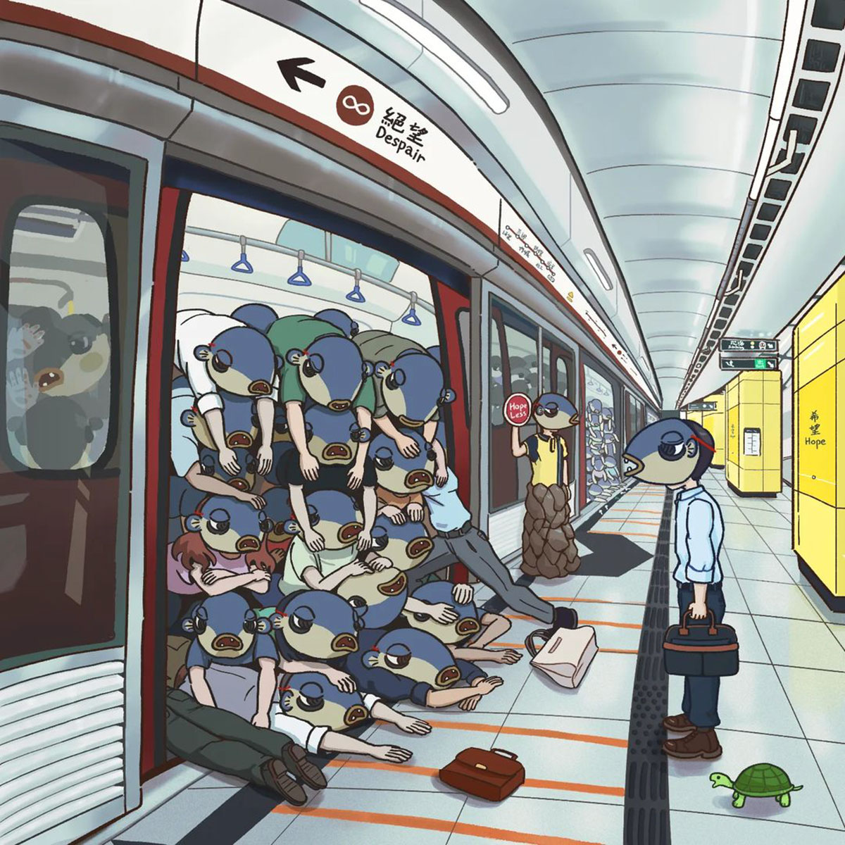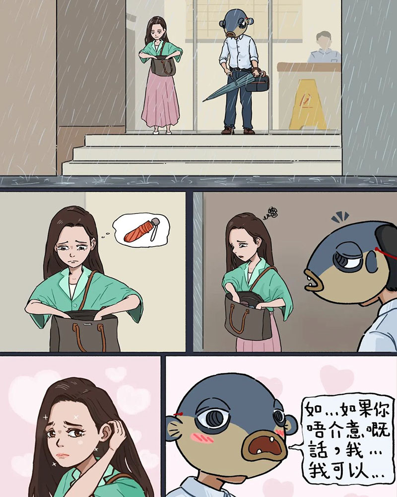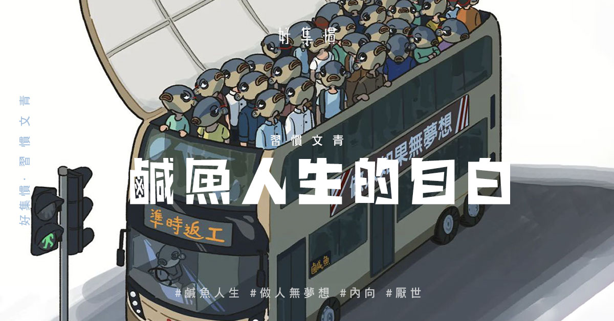在鹹魚人生 salted.fish_life IG 上,最近放上一幅插畫,寫着:朝早打開車蓋,可以見到裝滿了一整車沒有靈魂的鹹魚,大概是因為這城市再沒有值得期待的事情罷了。「我不是要放負,只是覺得如果你沒有什麼值得期待,覺得是鹹魚,你並不孤單。」鹹魚與你常在,也與你的心靈同在。又像名叫:這世界最柒罪名,叫太易動情。畫的是:下雨天,鹹魚借遮給身邊的女孩子⋯⋯那是真實故事嗎?「不,我不敢這樣做。」irene_someone_120留言:個女仔反應太大….佢諗多咗,下次有機會我遮番 fish 你,好嗎?「我會細讀每一個留言,看到這些留言,也會感動。」一條懂得自嘲的鹹魚,一個寧願自己一個人也不去應酬,一個會思考工作的意義的打工仔,一個會因創作而感動的人;你覺得你鹹魚定佢鹹魚?