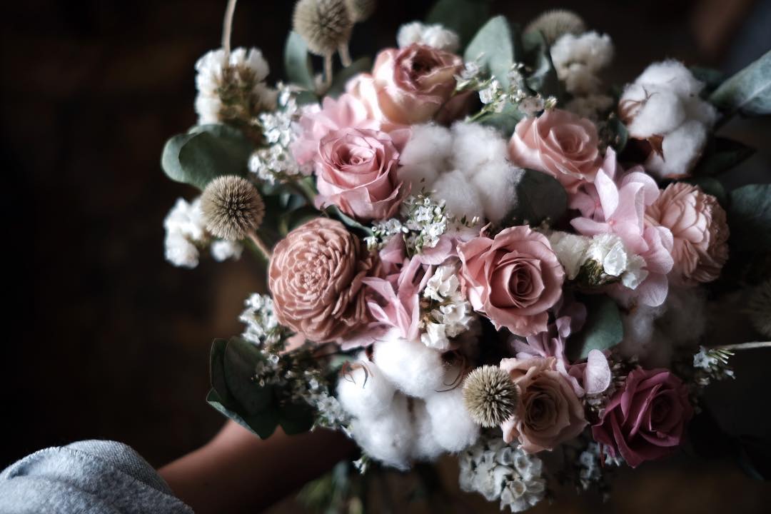 每位新娘不可缺少的花球,在婚禮結束後,無論你有多想留著也不得不丟棄,不妨考慮乾燥花吧。這門花藝既保留了鮮花的美態,而且在婚禮過後可以保留作裝飾。在乾花藝的領域,2009年創立的Pause Rewind n FastForward是先鋒之一,也是本港頗有名氣的花藝品牌。「PRFF」的名字由來與「保存」這個主題有關,他們多年來研發不同的手藝去「保存本該早逝的物料,以喚起人和時間關係的反思」,其乾花花束絕對是耐看耐擺的選擇。 - 復古婚紗: Tadpole Studio
