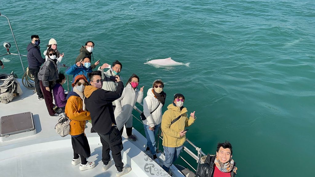 駛出大海,忽見海面上泛起暗湧,海水翻滾 —— 定睛一看,竟然是數十條海豚同時不斷貼近海面躍動,在船頭一直尋找海豚身影的 Emma 那瞬間感到心跳加速,完全震撼得說不出話來,「其實望到海豚們上水呼吸那下,已經覺得蕩氣迴腸!」