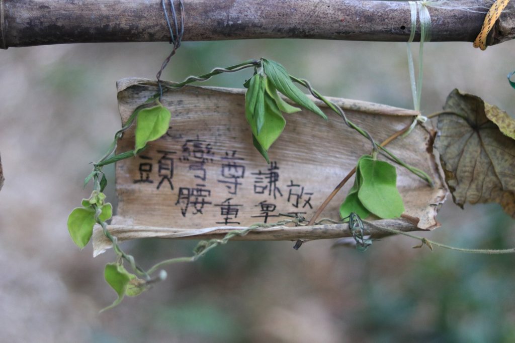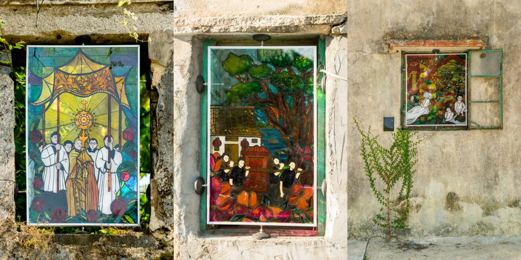 天主教的色彩,並不只限於這間小教堂內。事實上,這裡很多村屋曾經是修士居住的地方。難怪在一有些殘缺的玻璃窗上會有饒富宗教風格的彩繪圖案。在今年12月舉行的鹽田梓藝術節,香港藝術家姜立如延續了這種特色,在島上不同位置展出了總共七件玻璃彩繪,題為《鹽田梓·鄉情》,刻劃了她從村民口中得知的昔日難忘生活事件:嫁娶習俗、新生兒洗廬、客家婦女日出而作的情景。