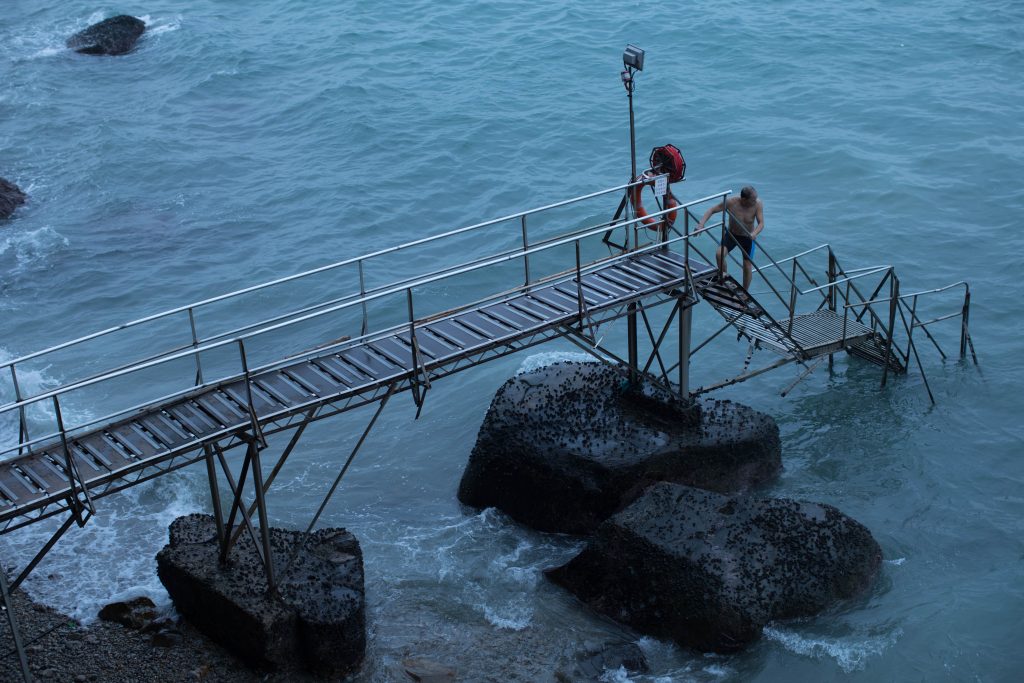清晨六時,天還未亮,我沿域多利道走到摩星嶺山腳的一段路,山旁有一條連接著海邊的石級樓梯,不太顯眼,路過的人不會察覺到它的存在。而樓梯的末端,就是被一層厚厚的叢林屏蔽多年的西環金鐘泳棚。我拿起電話照明,沿著那條石級往海邊行,雖然有零散的照明系統,但陡峭的山坡加上旁邊的叢林還是讓我感到不太安心,習慣了城市生活的我,總是對活在黑暗中的小生物有著無窮的想像。幸好樓梯不太長,數百米後就見到亮著微光的泳棚小屋,應該還未有人,我是那天泳棚的第一位訪客。