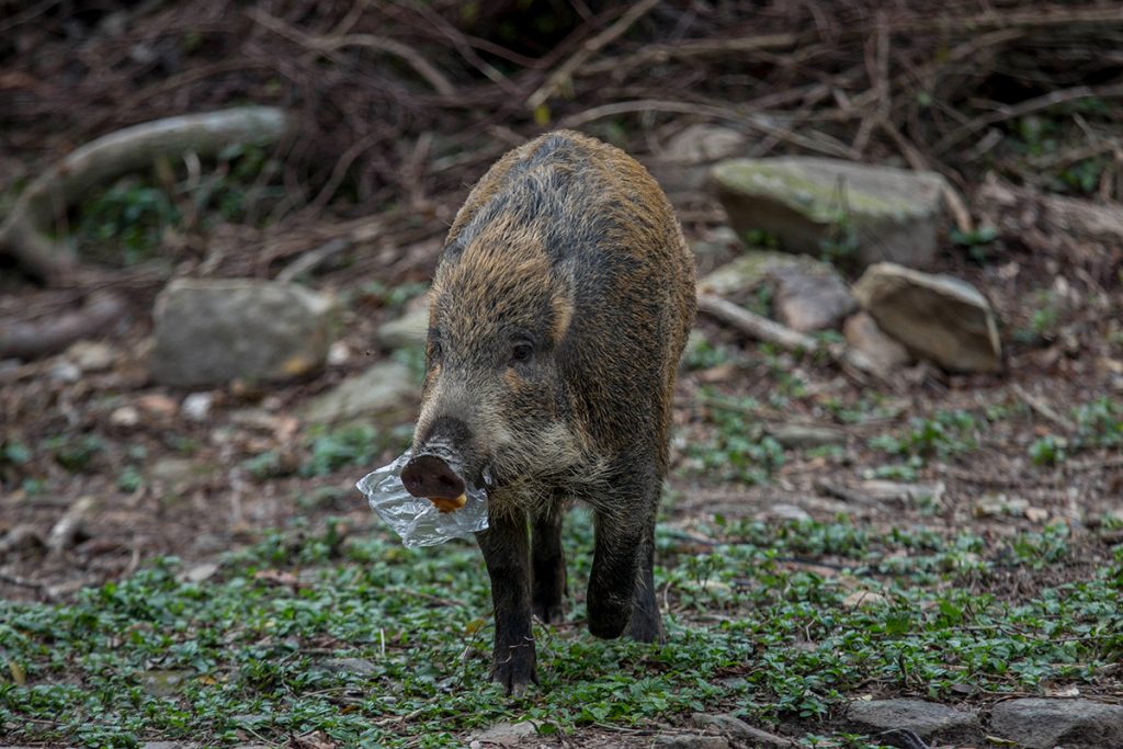 香港仔郊野公園,一隻野豬叼著膠袋,尋找食物。