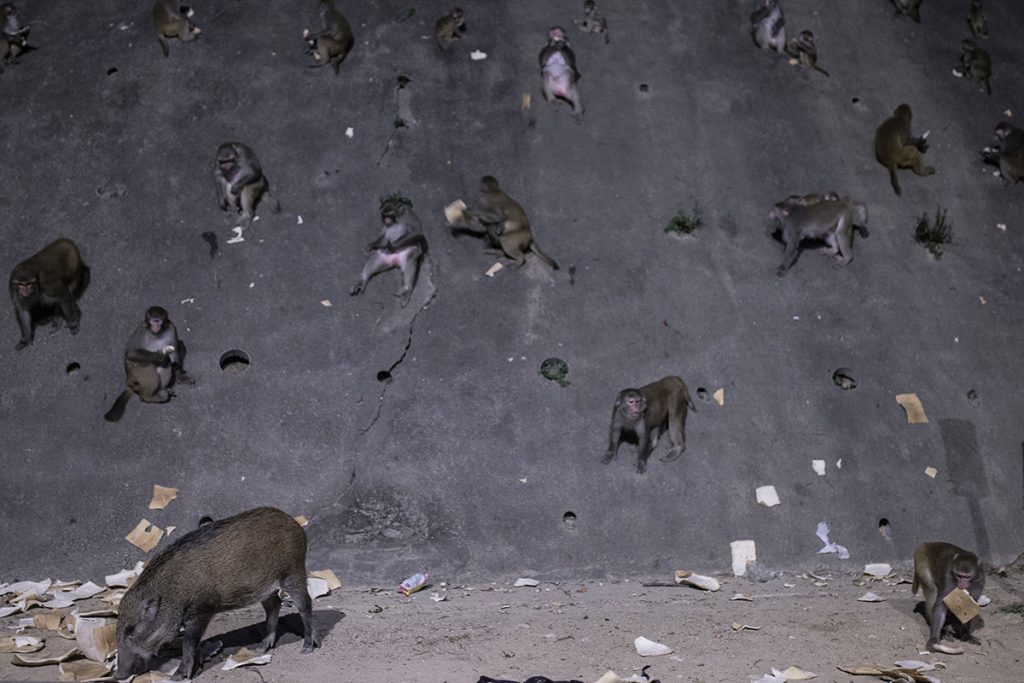 金山郊野公園,野豬與一群猴子一同分享麵包。