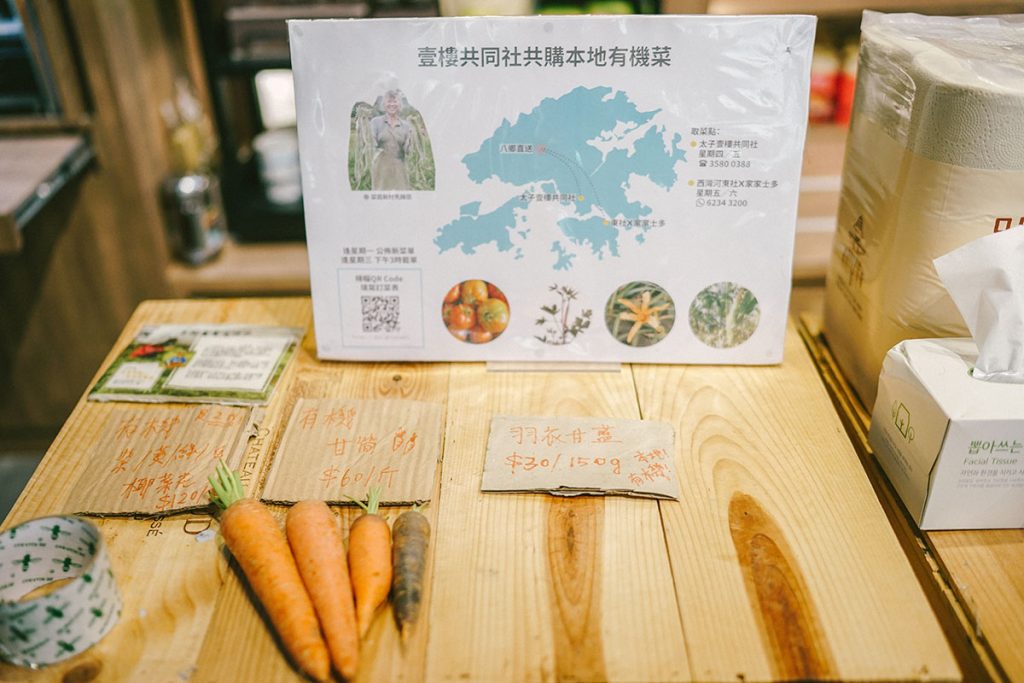 家家士多前放著一些木櫃,上面豎起了一塊板,寫上「壹樓共同社共購本地有機菜」,在這裏,可以共購由八鄉直送的羽衣甘藍、有機甘荀、有機紫/黃/綠/白椰菜花等,「本地太少人關心農業,但這對我們來說很重要。」