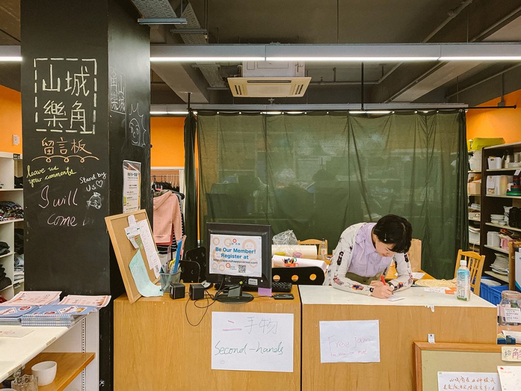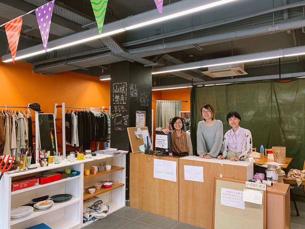 山城角樂,就在中大唯一一間連鎖超級市場的旁邊。踏進這裏,彷彿走進了一間社區中心——旁邊有電磁爐可供同學煮食的「社區廚房」,還可以租借餐具、微波爐;中間就是二手物部,放置從學生退宿時收集回來的二手用品;旁邊放置了幾個衣架,上面掛上了復古的二手衣服;近門口處則放置了一張長的木枱,還有沖咖啡的用具,「這裏大部分的東西其實都是執回來或者自己弄的。好像那些掛衣架本來是梯子來的,我們便用木板將它們進行改裝;那些放置二手物品的櫃,是中大其中一個圖書館一些用舊了的櫃子。」