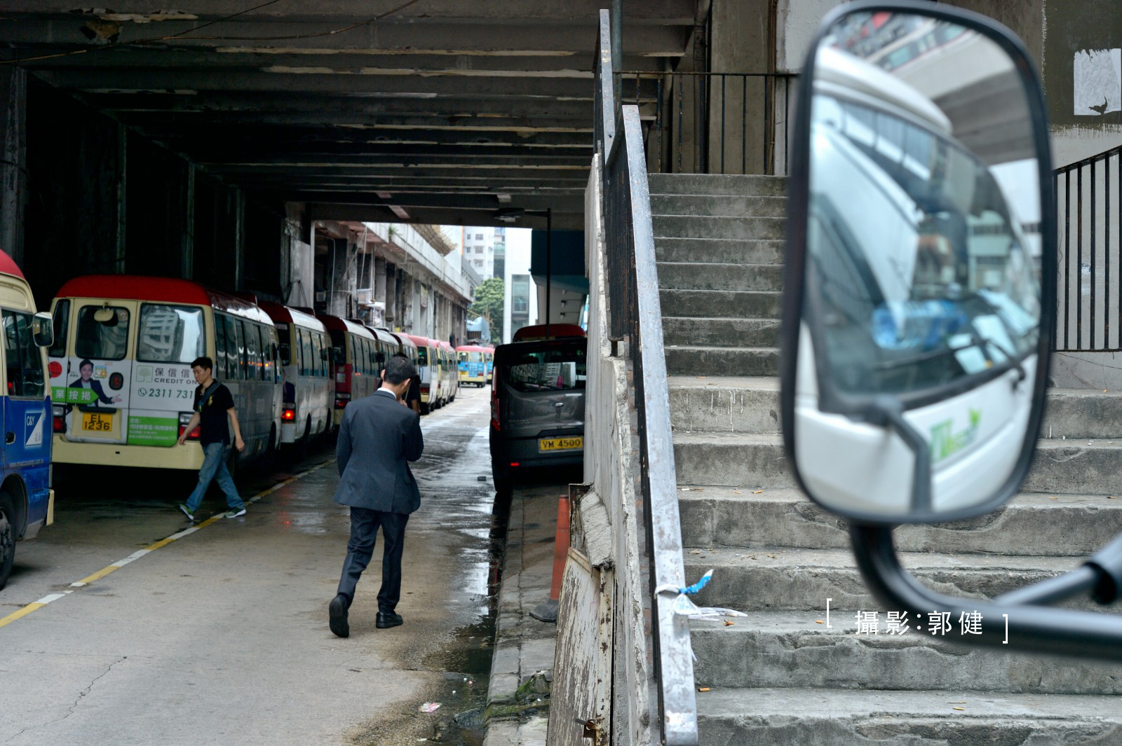 這個地方已被人拍攝過無數次,那個曾經因有攝影師攝下「天空之鏡」而成名的、小巴站上蓋的平台,後面的舊樓都被帆布封起來,架上了竹棚,一副準備清拆的模樣。來的人都是為了拍攝「天空之鏡」,但跟著郭健,往往會有新發現,「你看這裏很像地圖。」他看著斑駁地面,但偏偏,他卻對地下那攤水視若無睹,「大家只為攤水而來,卻忽略了平台其它事物。」